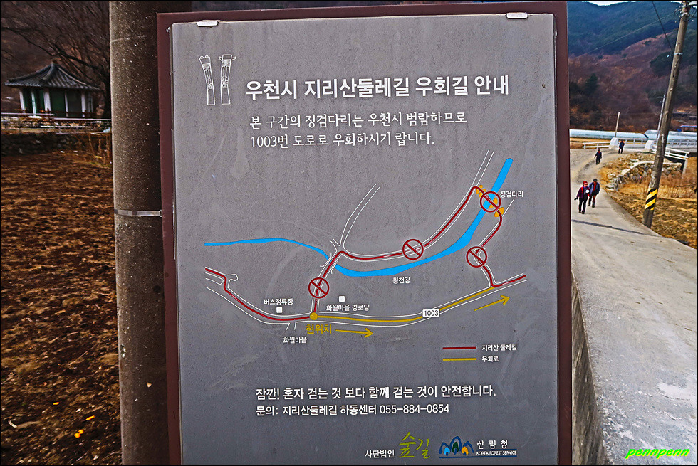 평촌마을회관과 청암복지회관을 지나갑니다. 화월버스정류소에서 우측으로 조금 가다가 횡천강의 징검다리를 건넙니다. 이 징검다리는 우기에는 건널 수 없으므로 그냥 1003번 지방도로를 이용하면 됩니다. 지방도로로 다시 나와 화월마을경노당에서 우측의 도로를 따라 걷습니다. 정자 옆 세 그루의 고목에서 잎이 돋아나면 장관일 듯하네요. 지방도로 양쪽의 가로수가 울창해 봄날에 걸으면 참 좋을 것입니다.