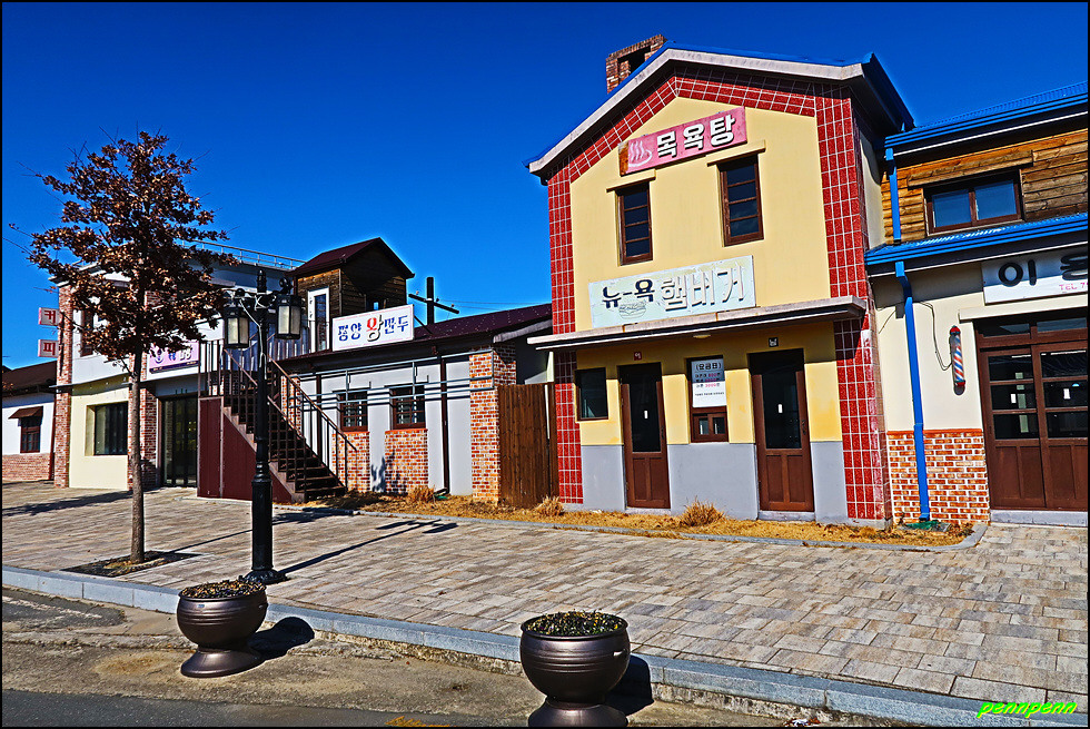 (뉴욕햄버거, 평양만두, 목욕탕, 이발소 등)가 붙어 있고,