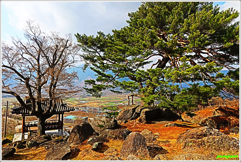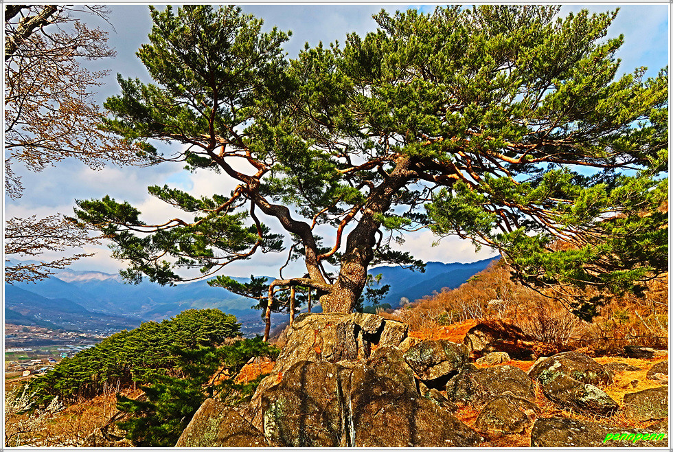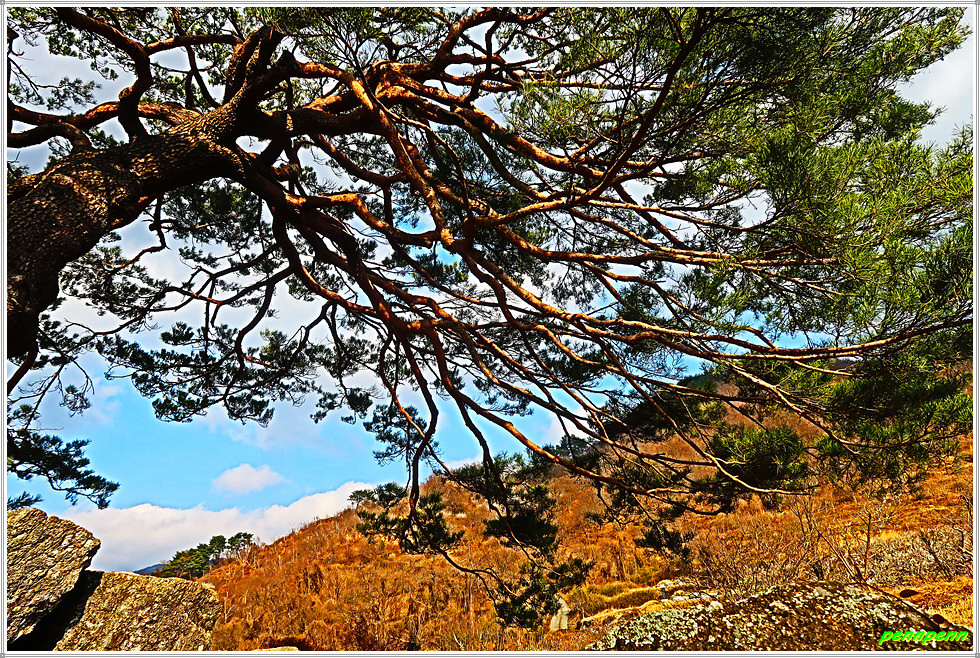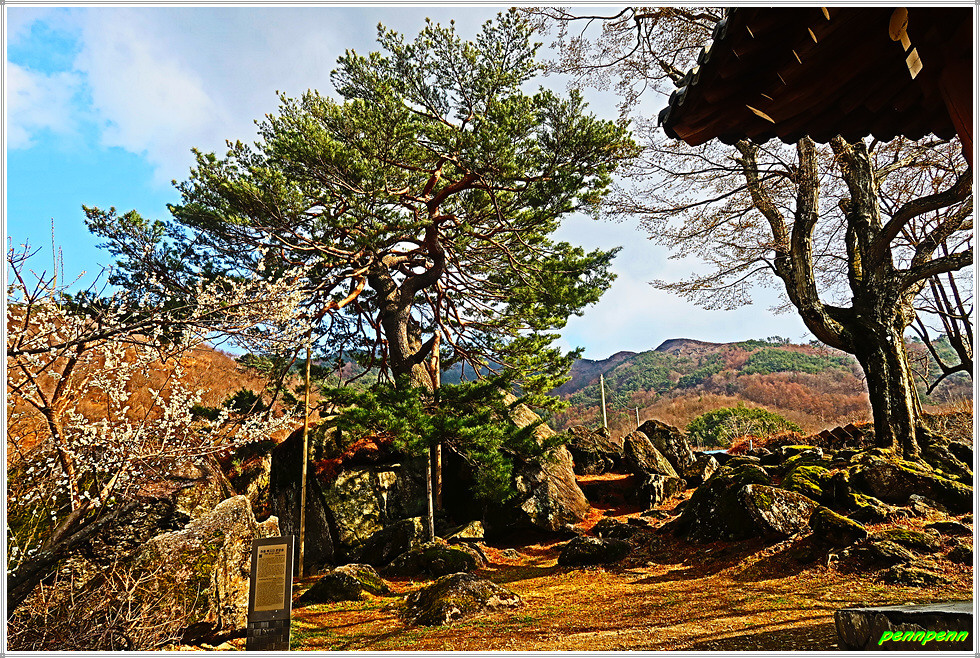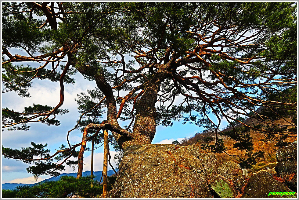 정자 뒤로 들어가면 장대한 소나무의 전모를 볼 수 있는데요. 수령 약 600년 정도로 추정되는 문암송은 높이 12.6m, 줄기 둘레 3.2m, 나무의 폭은 동서로 16.8m, 남북으로 12.5m에 이르는 거목으로 무엇보다도 바위틈에 뿌리를 내려 성장했다는 사실이 믿어지지가 않을 지경입니다. 문암송은 이러한 척박한 자연환경 속에서 자랐음에도 훼손된 부문이 전혀 없이 속리산 정이품 소나무에 견줄 정도로 아름답게 성장한 모습은 우리나라에서 자라는 소나무 중 최고의 걸작품이라고 해도 과언은 아닐 것입니다.