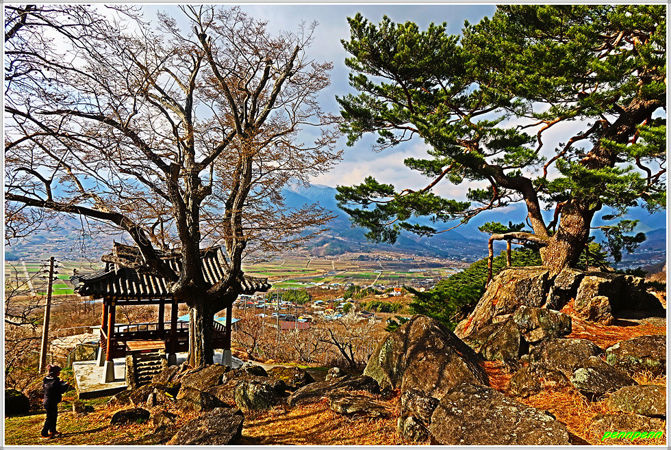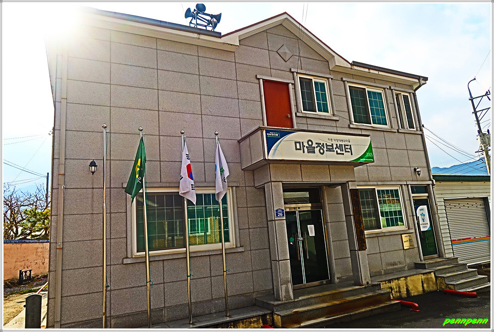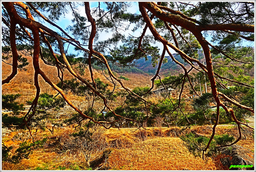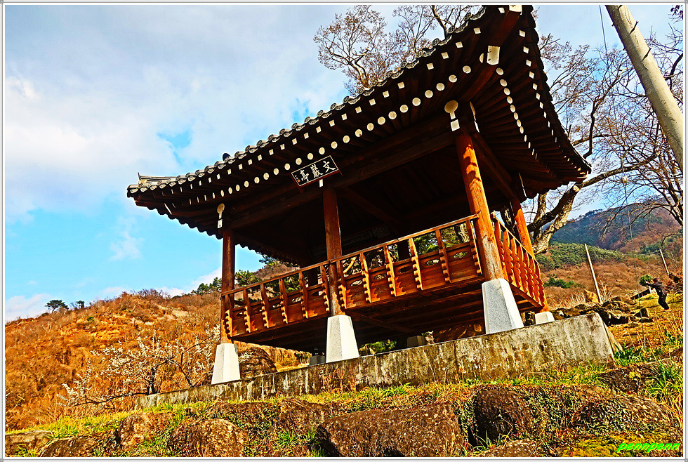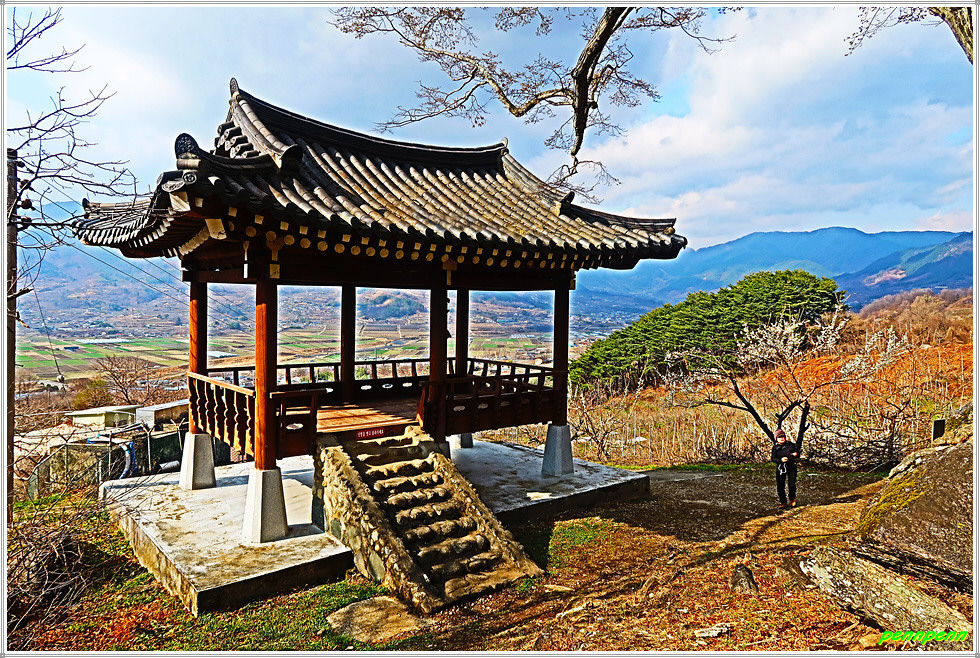 도로에서 약 200여 미터 안쪽에 위치한 대축마을회관을 지나자 또 다시 문암송 안내문이 보이는데 매화꽃을 감상하면서 천천히 발걸음을 옮깁니다. 서서히 고도를 높이면서 뒤돌아보면 최근 내린 눈으로 성제봉(1,100m)과 형제봉(1,162m)에 흰 눈이 쌓여있는 모습은 봄철 좀처럼 보기 드문 장관입니다.