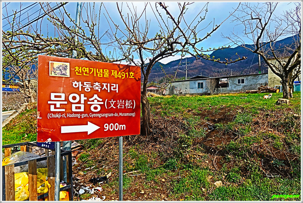 악양면 축지리 대축마을을 알리는 대형표석이 있는 도로변에는 문암송 안내문이 세워져 있는데 문암송까지의 거리는 약 900m입니다. 여기서 도로 쪽으로 100여 미터 직진하면 큼직한 문암송 안내문이 있으니 참고하기 바랍니다.