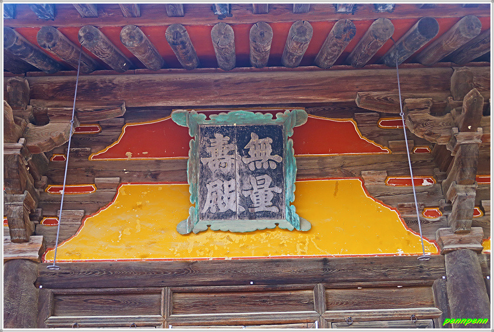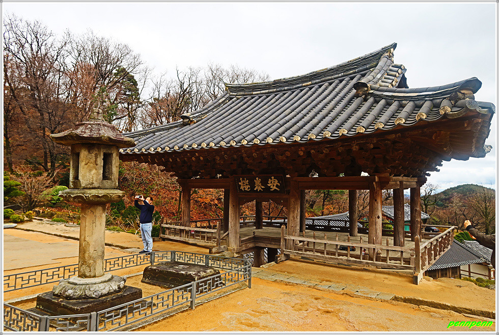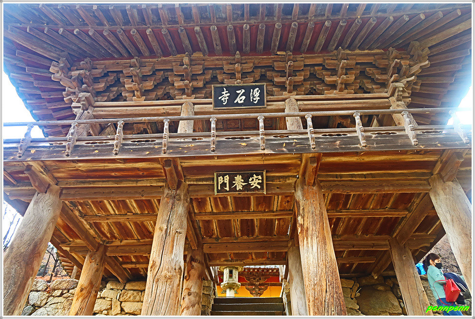 범종루를 뒤로하면 정면에 안양루가 있고 우측에는 요사채(사찰 내에서 전각이나 산문 외에 승려의 생활과 관련된 건물을 통칭하여 부르는 말)인 응향각과 장경각(불교의 경전을 적은 책이나 목판을 보관)이 있습니다. 범종루는 무량수전과 함께 부석사의 중심 건축물입니다. 정면에는 그냥 "부석사" 현판이 걸려 있는데, 그 아래에는 안양문 현판도 보입니다. "부석사" 현판글씨는 초대 대통령 이승만 박사의 친필입니다. 안으로 들어서면 안양루(安養樓)라는 큼직한 현판이 달려 있습니다. 하나의 건물에 누각과 문이라는 2중의 기능을 부여했군요. "안양"은 극락이므로 안양문은 극락세계에 이르는 입구를 상징합니다. 따라서 극락세계로 들어가는 문을 지나면 바로 극락인 무량수전이 위치한 구조로 조성되어 있습니다.