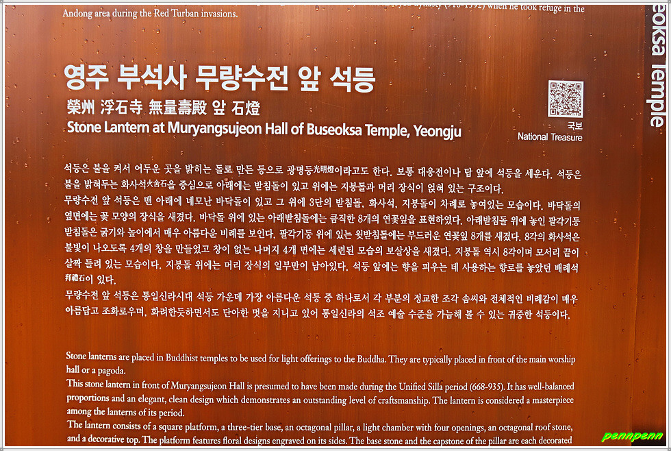 무량수전 안에는 소조아미타여래좌상(국보 제45호)이 있는데, 고려 초기 흙으로 빚은 작품으로 상당히 정교하게 만들었다고 합니다. 이 불상은 사찰 중 유일하게 법당 중앙이 아닌 서쪽에 모셔져 있고 정면인 남쪽을 보지 않고 측면인 동쪽을 바라보는 점이 매우 이채롭습니다. 무량수전과 안양루 사이에 있는 석등(국보 제17호)은 높이가 2.97m에 달하는 신라시대의 전형적인 팔각석등으로 상하비례와 조각이 매우 정교해 신라시대 석등 중 걸작품이라고 합니다. 무량수전 좌측에는 부석사라는 이름을 낳게 한 부석(浮石, 뜬돌)이 있지요.