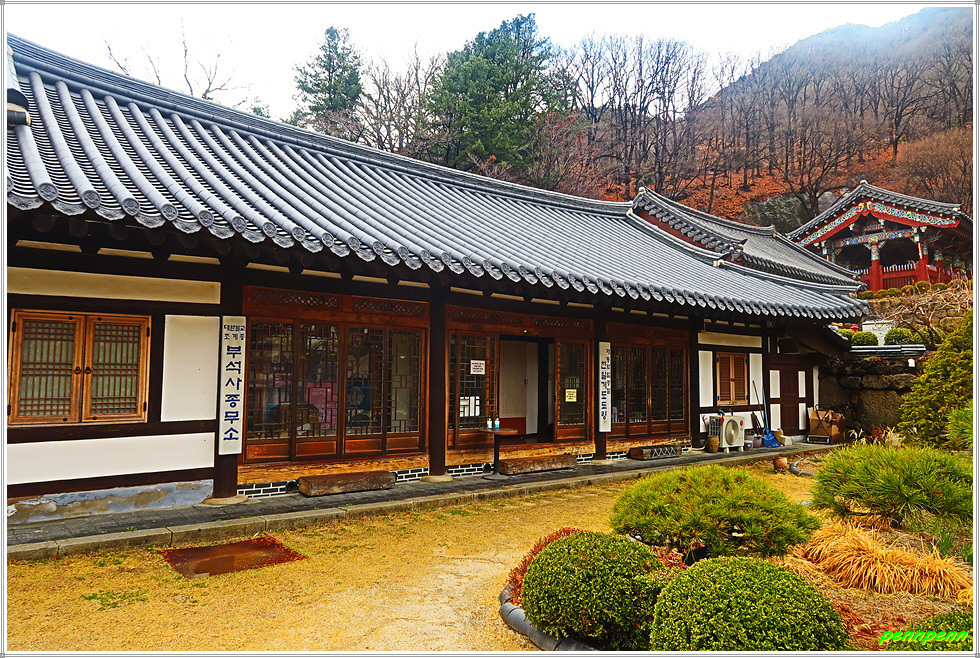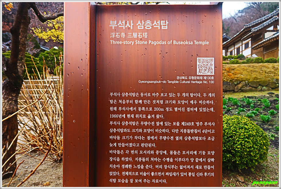 석축을 올라 관광안내소가 있는 회전문을 통과하면 비로소 부석사의 진면목을 볼 수 있지요. 여기서 제일 먼저 만나는 문화재는 북지리 동서 삼층석탑(경북도 유형문화재)입니다. 통일신라시대의 석탑이라는데 보물로 지정되지 않은 게 의아스럽네요. 삼층석탑 좌측에는 종무소가 있습니다.