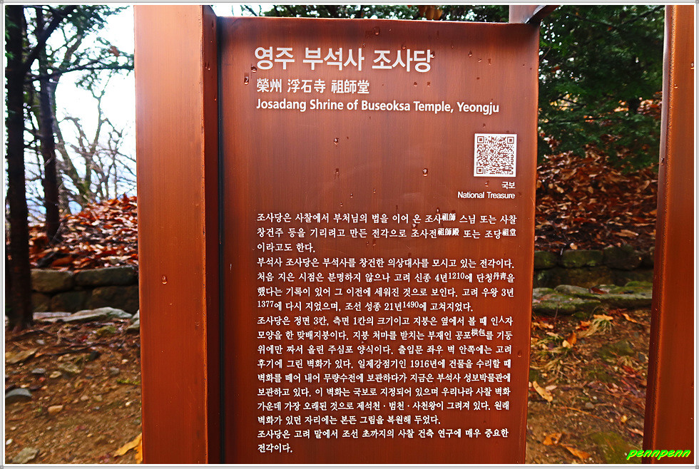 조사당(국보 제19호)은 사찰에서 불교 종파의 조사(祖師) 또는 사찰의 창건주 등을 기리기 위하여 건립한 불교건축물로서 이 조사당은 의상대사의 상(像)을 모시고 있습니다. 조사당은 정면 3칸‚ 측면 1칸 규모의 작은 전각으로 고려 우왕 3년(1377)에 원융국사가 재건한 것입니다. 부석사 조사당 벽화(국보 제46호)는 모두 6점으로 우리나라의 사원벽화 가운데 가장 오래된 것이라고 합니다. 필자는 조사당 내부의 불화를 국보로 착각했는데 그림이 달라 확인해보니 원래 조사당에 있었던 이 벽화는 현재 무량수전에 보관중이라고 하지만 실물을 보지는 못했습니다.