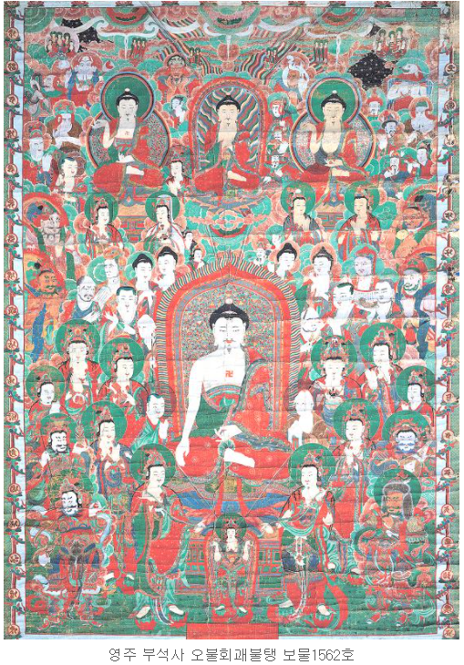 이 밖에도 부석사에는 고려각판(보물 제735호) 및 오불회괘불도(보물 제1562호)가 있는데요. 고려각판은 고려후기인 13~14세기에 제작된 삼본화엄경(三本華嚴經)의 불교 목판 총 3종 634판으로 장경각에 보존되어 있지만 실물을 확인하지는 못했습니다. 오불회괘불도는 1745년 조성된 것으로 원래 부석사에는 이 괘불도가 제작되기 전인 1684년에 제작된 것이 있었으나 이를 제천 신륵사로 옮기고(현재 국립중앙박물관 소장) 새로 제작했다고 합니다. 오불(五佛)의 주인공은 비로자나불, 약사불, 아미타불, 석가모니불, 노사나불이라고 하는군요. 이 괘불도는 부석사 박물관에 보관중일 것으로 추정됩니다.(필자생각)