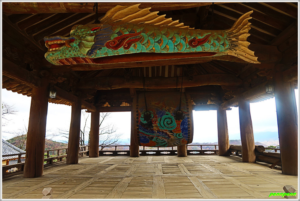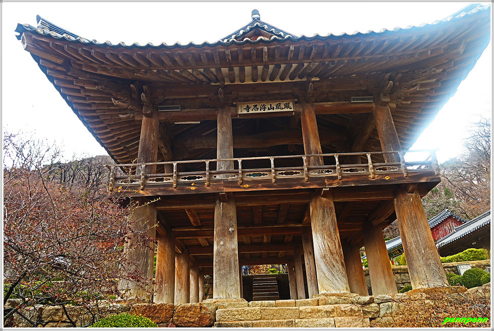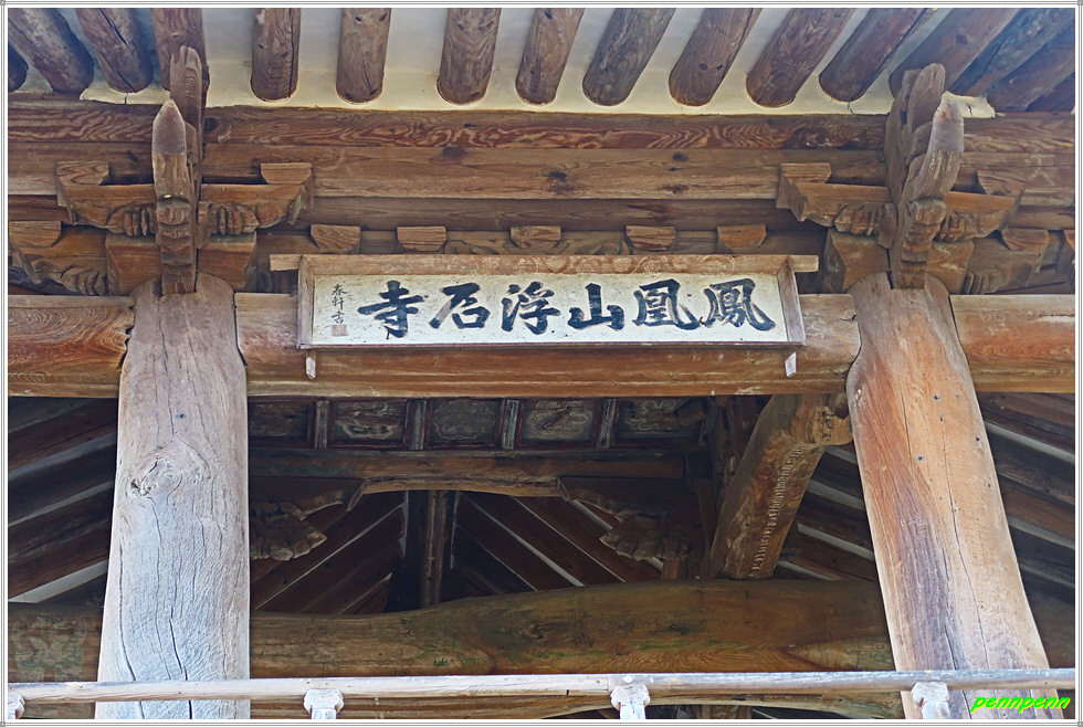 삼층석탑을 뒤로하면 봉황산 부석사라는 현판이 붙은 2층 누각인 범종루입니다. 범종루에는 통상 범종이 있어야 하지만 원래 이곳의 범종은 좌측의 범종각으로 옮기고 현재는 법고(法鼓)와 목어(木魚)만 걸려 있습니다. 범종루는 단청을 칠하지 않은 단아한 모습이 매우 아름답습니다. 범종루의 지붕은 한쪽은 맞배지붕을 하고 있고 다른 한쪽은 팔작지붕을 하고 있다는데 무척 어려운 용어로군요.