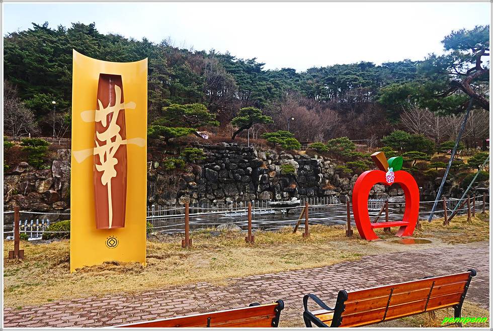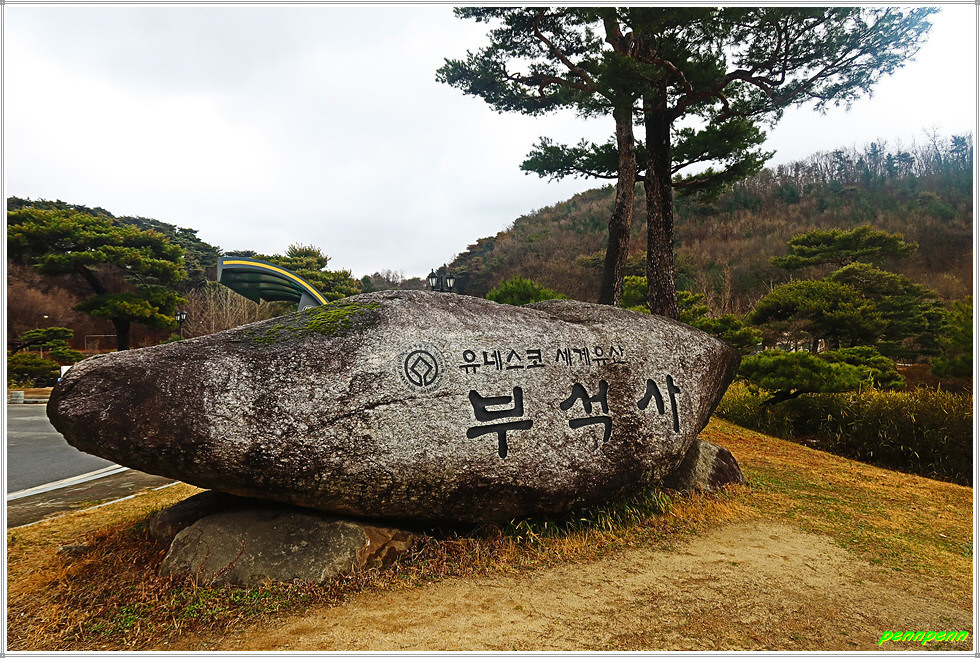 주차장에서 부석사로 오르는 길목에는 대형 부석사 표석이 있고 그 뒤로 폭포공원이 보이는데, 공원에는 영주사과 조형물과 화엄종찰을 의미하는 대형 화(華)가가 새겨진 입석시설물이 있습니다. 실제로 폭포공원의 분수대가 가동될 경우 그 풍경이 매우 멋질 것 같습니다. 폭포공원 위쪽에는 2018년 유네스코 세계문회유산으로 등재된 “산사, 한국의 산지승원”에 대한 안내문이 있는데 이들은 7세기에서 9세기에 창건된 7개의 사찰(양산 통도사, 영주 부석사, 안동 봉정사, 보은 속리산 법주사, 공주 마곡사, 순천 선암사, 해남 대흥사)을 말합니다.