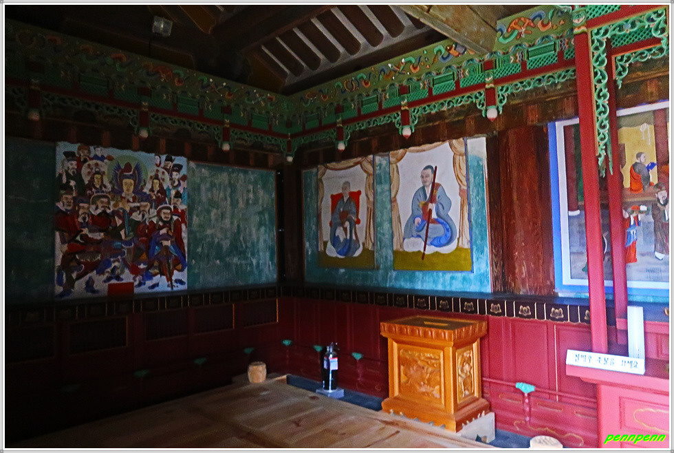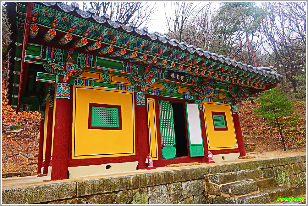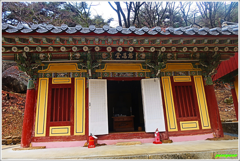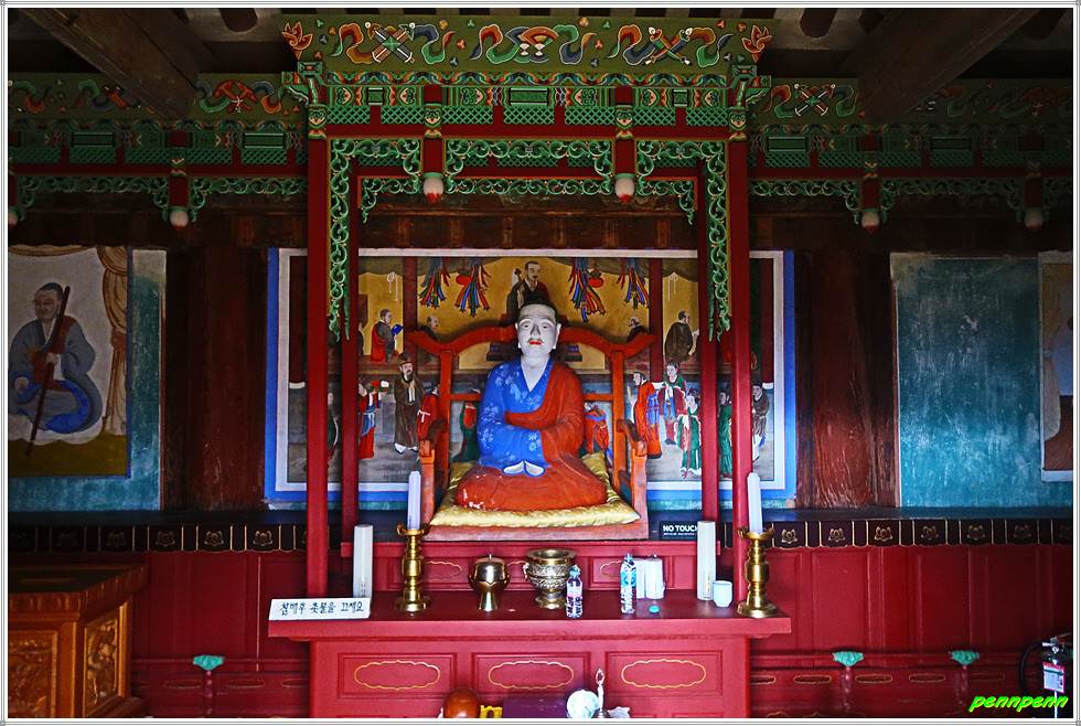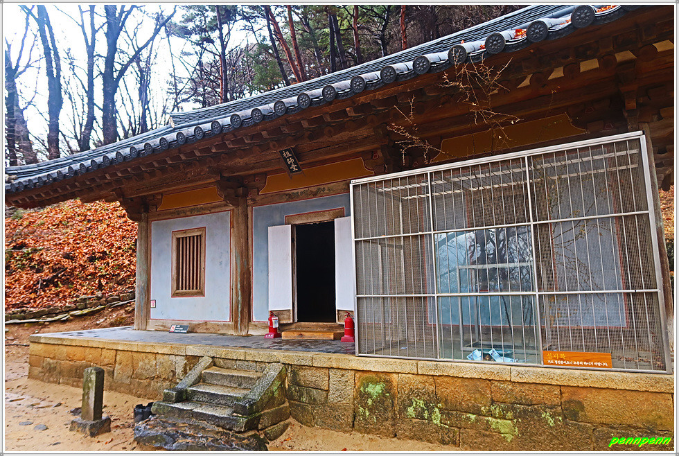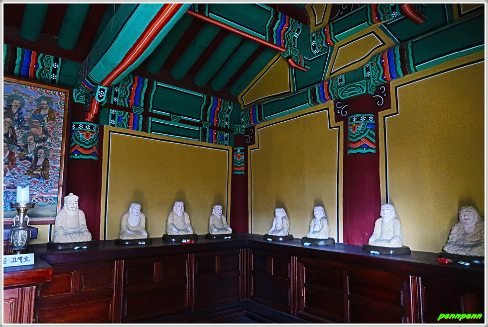 조사당 우측에는 응진전이 있는데, 이 전각은 사찰에서 석가모니를 본존으로 모시면서 그 제자들(16나한)에 대한 신앙세계를 함께 묘사한 불교건축물입니다. 응진전 우측 뒤쪽의 단하각은 손에 쥐를 들고 있는 작은 나한상을 모시고 있습니다.