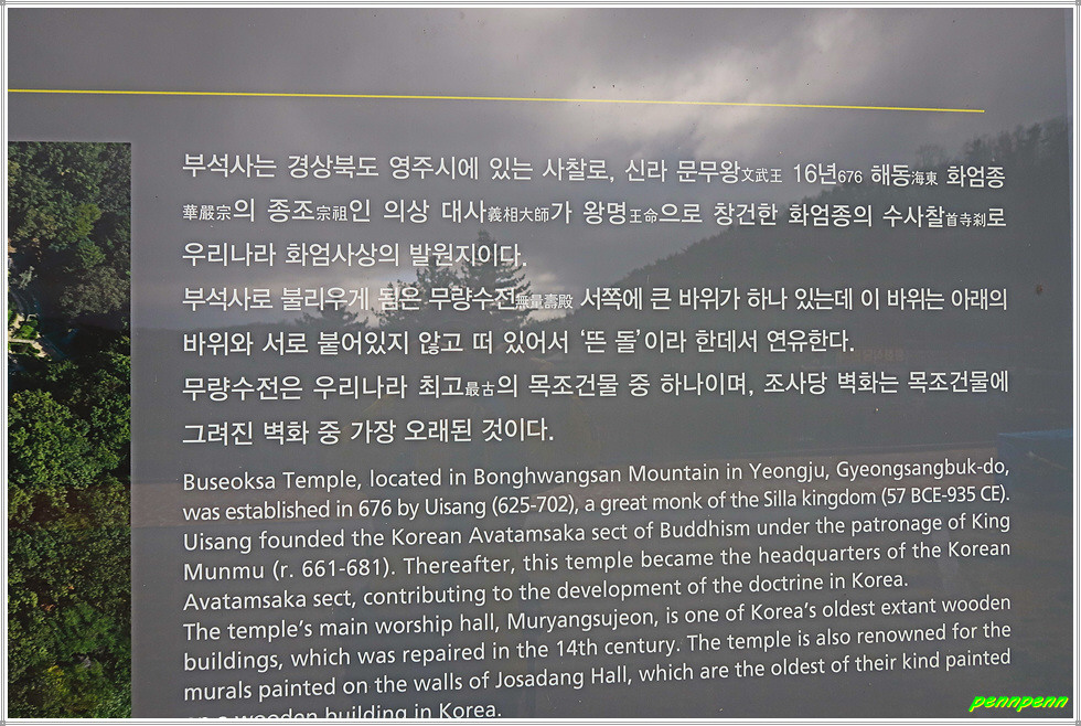 경북 영주시 부석면 소재 부석사(浮石寺)는 소백산과 태백산의 사이인 봉황산 중턱에 위치하고 있는 천년고찰로 신라 문무왕 16년(676) 화엄종의 종조(宗祖)인 고승 의상대사가 왕명을 받들어 화엄의 큰 가르침을 펴던 곳으로 한국 화엄종(華嚴宗)의 근본도량입니다. 부석사는 유네스코 세계문화유산으로 지정된 곳으로 단일 사찰로는 가장 많은 국보(5점)와 보물(6점)을 간직하고 있습니다. 국보인 무량수전은 우리나라 목조건축물을 대표하며, 안양루에는 방랑시인 김삿갓이 부석사를 노래한 시 한수가 걸려있고, 조사당 앞에는 의상대사가 사용하던 지팡이를 꽂아 자랐다는 1,300여년의 선비화가 있습니다.