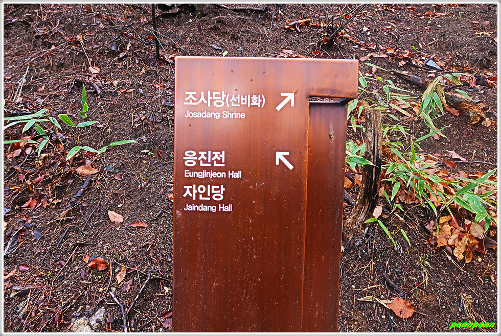 이제는 부석사의 가장 높은 산비탈에 자리 잡은 자인당과 조사당을 둘러볼 차례입니다. 일반인들은 부석사 경내배치도를 잘 살펴보지 않으면 그냥 지나치기 쉽지만 이곳에는 국보 2점과 보물 2점 그리고 의상대사의 지팡이가 나무로 변했다는 선비화가 있기에 관심이 있는 독자라면 반드시 답사할 것을 권장합니다. 삼층석탑 우측에 조성된 산책로를 따라 약 100여 미터 오르면 Y자형 갈림길인데 먼저 우측의 조사당으로 갑니다.