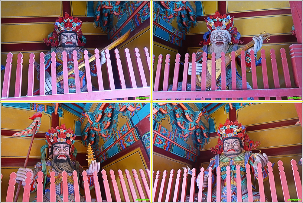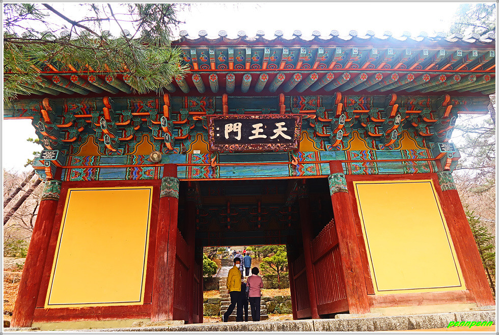 당간지주를 지나면 천왕문인데, 일주문을 지난 다음에 보이는 문으로 불법을 수호하는 사천왕들이 모셔져 있습니다. 사천왕들은 부릅뜬 눈과 크게 벌린 입, 발 밑에 마귀가 신음하고 있는 듯한 모습이 보는 이들을 두렵게 만드는데, 이는 악귀의 범접을 막고 절을 찾아온 중생들의 마음속에 있는 잡념을 없애주기 위함입니다.