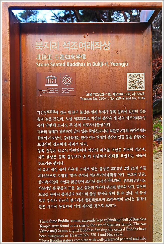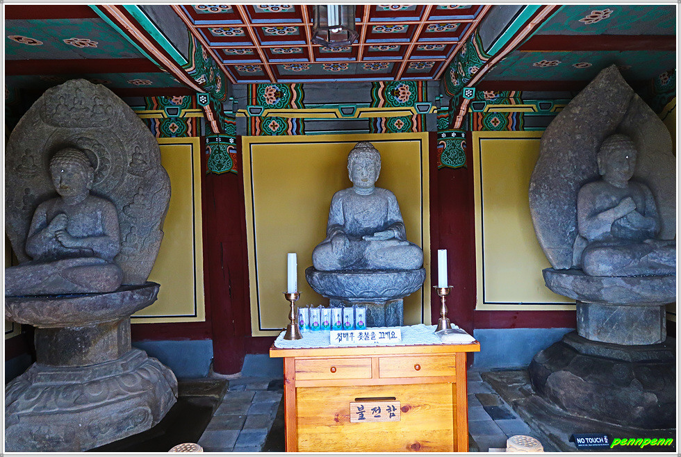 조사당을 내려와 좌측 자인당으로 갑니다. 자인당은 선방의 용도로 사용되던 건물로 현재는 부석사에서 동쪽으로 약 1.5킬로미터 떨어진 폐사지에서 옮겨 온 석불을 이곳에 모시고 있습니다. 3점의 석불 중 좌우 양쪽의 불상은 비로자나여래좌상(보물 제220호)이며, 가운데 석불은 석가여래좌상(보물 제1636호)입니다.