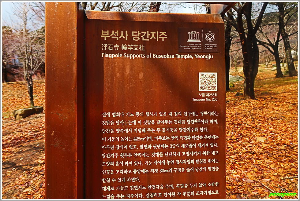 조금 더 오르면 좌측에 통일신라시대의 당간지주(보물 제255호)가 있는데, 부석사에서 첫 번째로 만나는 보물입니다. 당간지주는 당(幢 : 불화를 그린 旗)을 걸었던 장대인 당간을 지탱하기 위하여 당간의 좌·우에 세우는 기둥을 말합니다. 통일신라시대의 당간지주는 현재 단 3기만 남아있다고 하네요. 당이라는 깃발은 절에서 불교의식이 있을 때 부처와 보살의 공덕을 기리거나 마귀를 물리칠 목적으로 달았던 기(旗)를 말합니다. 현재는 한쌍의 돌기둥 만이 남아 있는데, 그 높이는 4.28m에 달합니다.