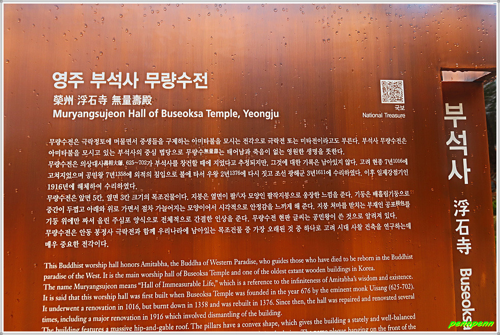 안양루 맞은편은 바로 부석사를 대표하는 무량수전(국보 제18호)입니다. 무량수전은 우리나라에서 가장 오래된 목조건물 중의 하나로 배흘림기둥으로 유명하며 한국건축의 가장 빼어난 작품으로 평가받고 있습니다. 무량수전은 고려 현종 7년(1016) 원융국사가 중창하였다고 전합니다. 무량수전은 정면 5칸 측면 3칸 규모의 팔작지붕형식입니다.