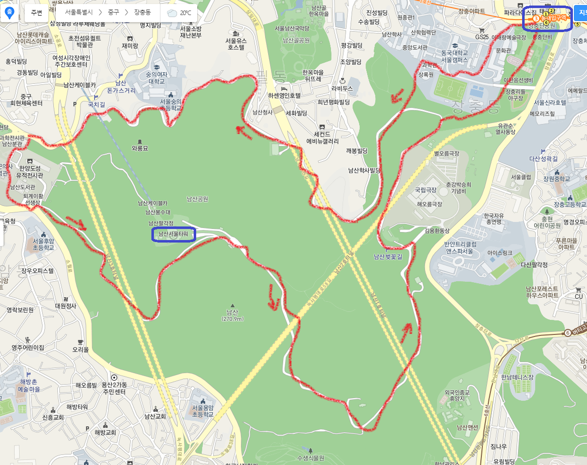 여기서 순환도로를 따라 갑니다. 국궁의 요람인 석호정을 지나 장충공원 310m, 동국대학교 305m 이정표에 의거 우측의 계단을 내려섭니다. 아까 남산 전망대에서 보았던 서울신라호텔이 바로 눈앞에 있네요. 도로를 건너면 인기가수 배호가 노래한 장충단공원입니다. 공원을 가로질러 나오면 동대입구역 6번 입구입니다.