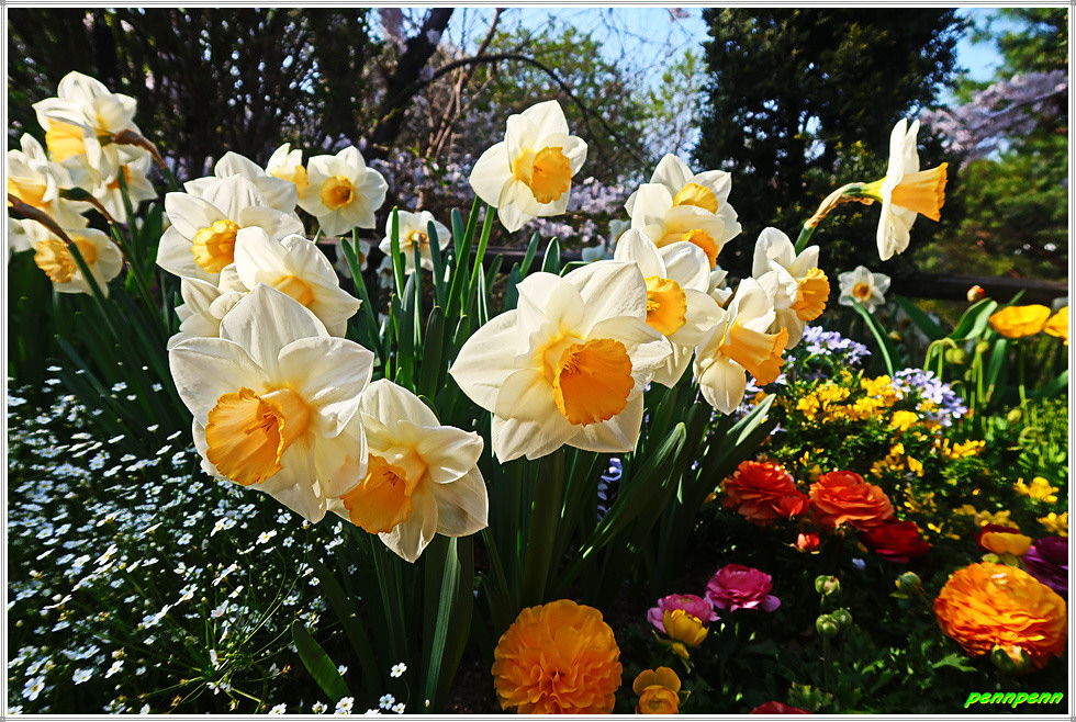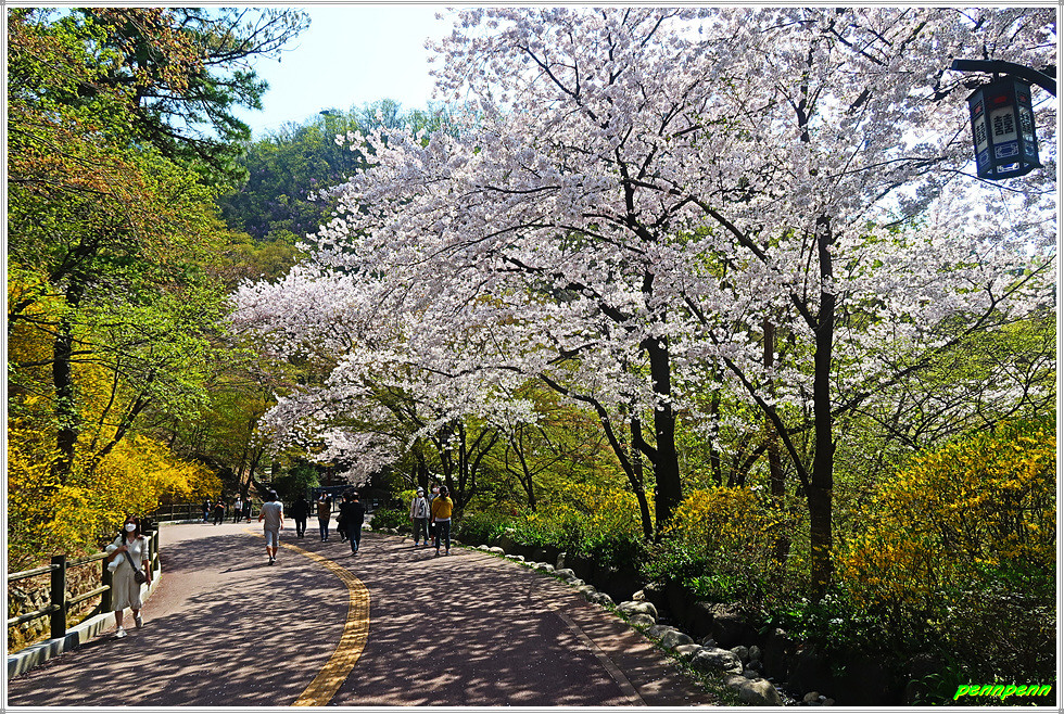 전망대를 뒤로하고 발걸음을 옮깁니다. 산책을 나온 시민들이 제법 보이더군요. 남산N서울타워가 나타났다가 사라지기를 반복합니다. 쉼터에는 다양한 봄꽃으로 단장되어 있어 벚꽃만 보는 단조로움을 해소시켜줍니다. 남산골한옥마을 갈림길을 지나가는데 좌측 골짜기에는 목멱산(남산) 와룡묘가 있습니다. 중국의 삼국지에 나오는 제갈량(와룡)과 관우의 상을 모시는 사당이 우리나라 남산에 있다는 게 믿어지지 않을 정도입니다.