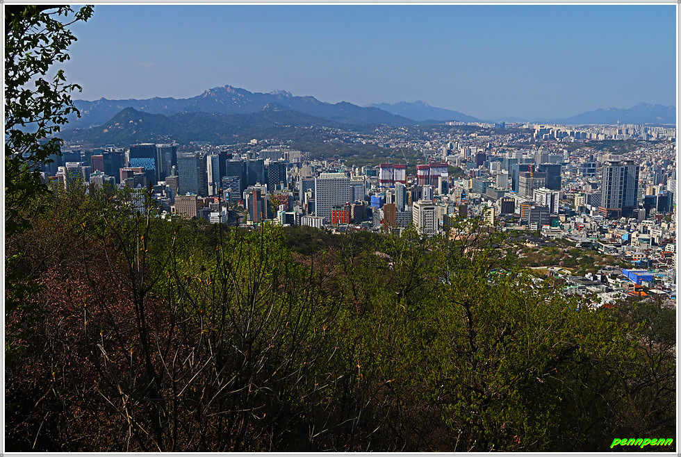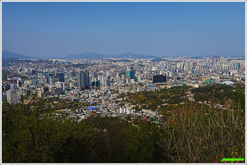 100년비를 지나 건물 사이의 계단을 오르면 남산순환로로 접근하는 높은 계단이 보이는데 약 100여 미터를 오르면 북부순환도로에 다다릅니다. 순환도로에서 좌측은 국립극장으로 가는 길이므로 우측 N서울타워 이정표를 따라 걸으면 오케이입니다. 길의 양쪽에 벚꽃이 피어 있네요. 필동전망대에 서면 북악산 뒤로 북한산 비봉능선이 선명하게 보입니다.