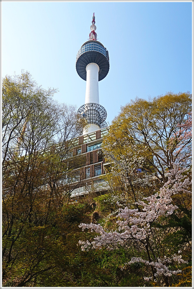 남측순환로 입구(주차장)를 지나 남산순환버스가 다니는 길(일방통행)로 들어섭니다. 야외식물원 갈림길을 지나 서울타워 이정표를 따라 걷습니다. 서울타워 전망대가 보이네요. 도로의 양쪽에 늘어선 벚나무가 벚꽃터널을 형성하고 있는 모습입니다.