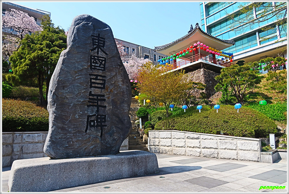 여기서 약간 경사면을 오르는데 양쪽에 벚꽃이 만개해 이어 초입부터 마음을 설레게 합니다. 동국대 정문 안으로 진입해 큰 길을 따라가면 보이는 정각원은 원래 경희궁 숭정원 건물이었으나 일제가 해체해 이곳으로 옮긴 것으로 현재 동국대 법당으로 사용되고 있습니다. 정각원 앞에는 동국100년비가 세워져 있군요.