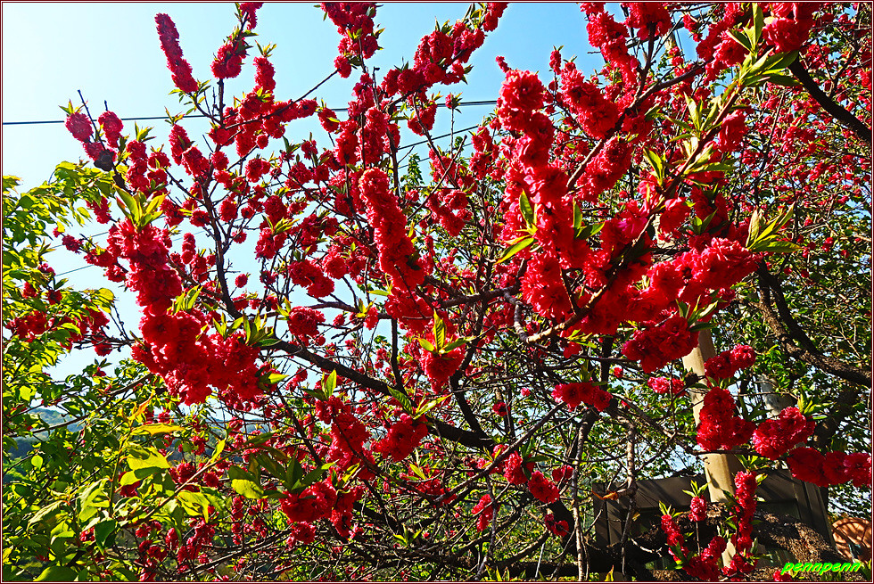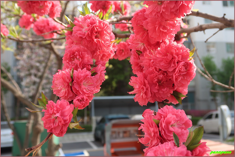 잎이 하나도 보이지 않고 붉은 꽃만 무성한 게 매화와 유사합니다.