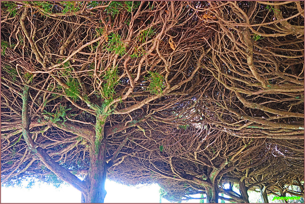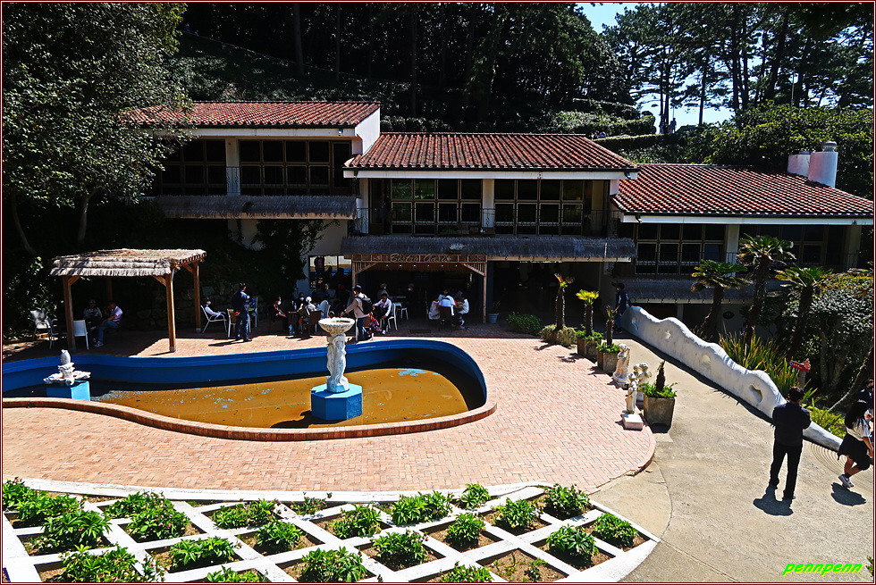 분수대 삼거리로 내려와 한 구비를 돌아가면 주황색 지붕의 기념품점이 있고 마당은 물의 정원입니다. 물의 정원에는 건기여서 그런지 물이 없더군요. 이름 모를 나무의 가지는 마치 예술작품 같습니다. 내려다보니 진입구간인 외도광장에 많은 사람들이 모여 있군요.