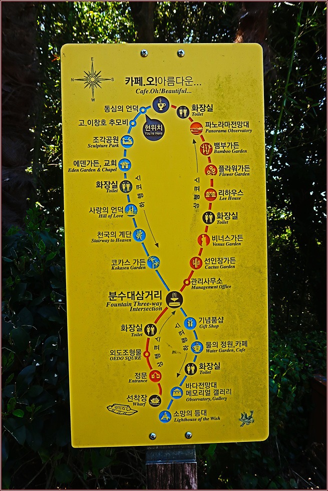 이제부터는 관람방향이라고 적힌 화살표를 따라 가면서 차근차근 보타니아의 진수를 감상할 차례입니다. 코스를 돌다보니 상행코스와 하행코스를 8자형식으로 제작한 안내도가 있었는데 이런 관람코스 안내도는 외도광장에 세워져 있었더라면 참 좋았을 것입니다.