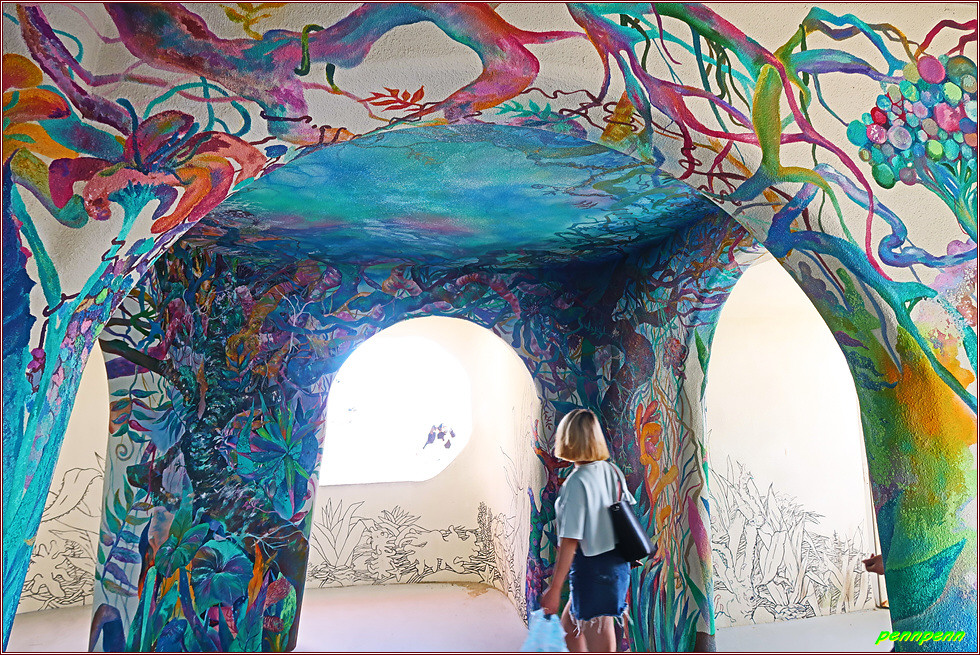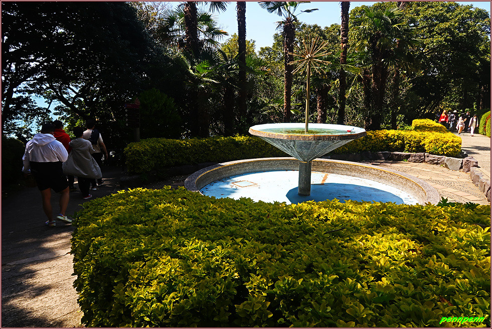 나무를 꼬깔모자처럼 다듬은 모습은 보기에도 신기하네요. 야자나무숲이 보이는 통로를 가노라면 분수대삼거리인데 이곳은 매우 중요한 포인트입니다. 왜냐하면 이곳은 상행과 하행의 교차점이기 때문입니다.
