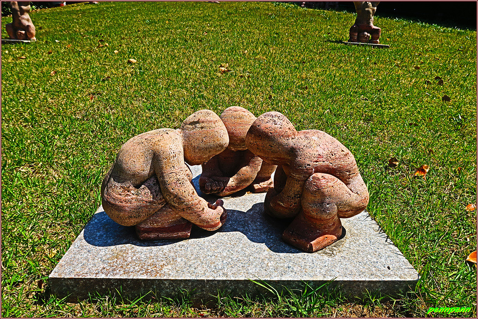 카페를 나오면 동심의 언덕인데요. 이곳에는 어린이들이 재미있게 노는 모습을 조각작품으로 표현한 작은 언덕입니다. 이런 모습은 동네의 마당과 골목길 그리고 뒷동산에서 우리의 할아버지와 할머니들이 어렸을 적 즐겨하던 놀이입니다. 무엇보다도 이곳에서 바라보는 벤베누토정원과 비너스가든은 푸른 남해바다와 어우러져 감탄이 저절로 나옵니다.