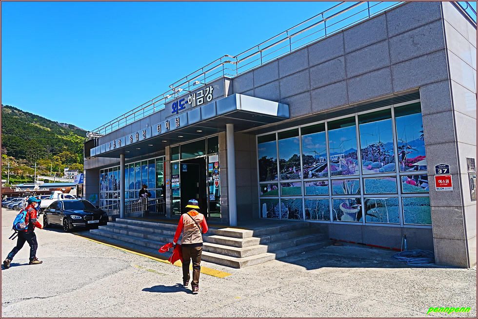 배를 타고 해금강을 한 바퀴 돌아본 후 외도로 향합니다. 구조라항에서 유람선을 탄 다음 해금강을 돌아서 외도선착장에 도착하는 데 45분이 소요되었습니다.