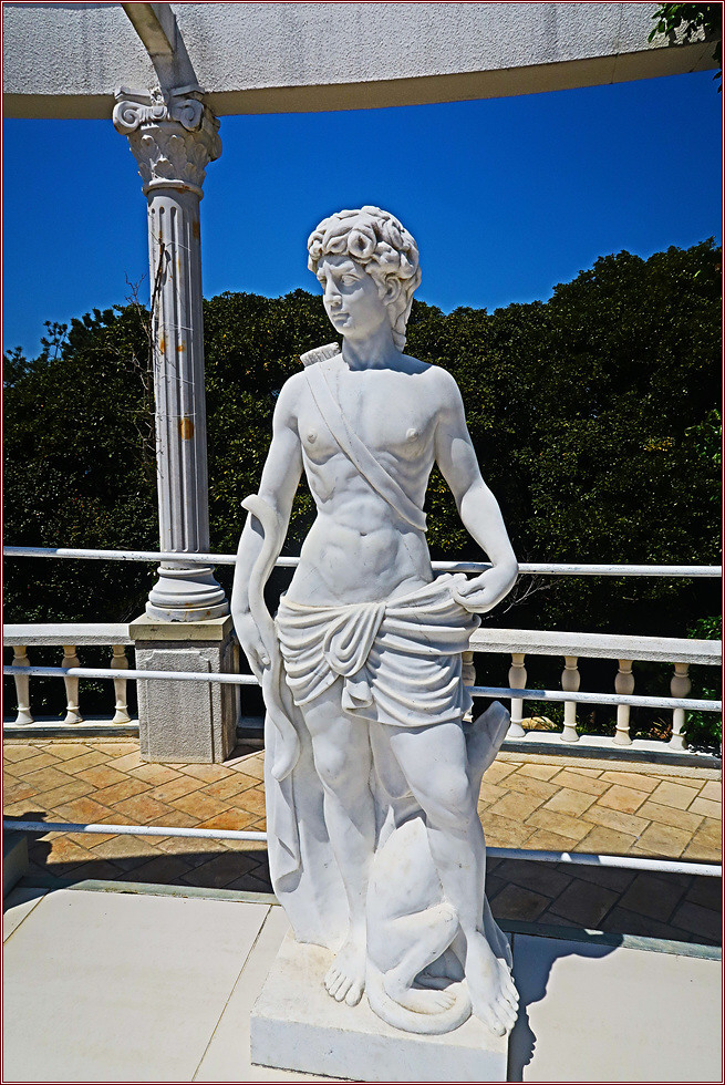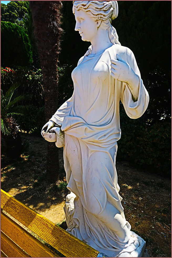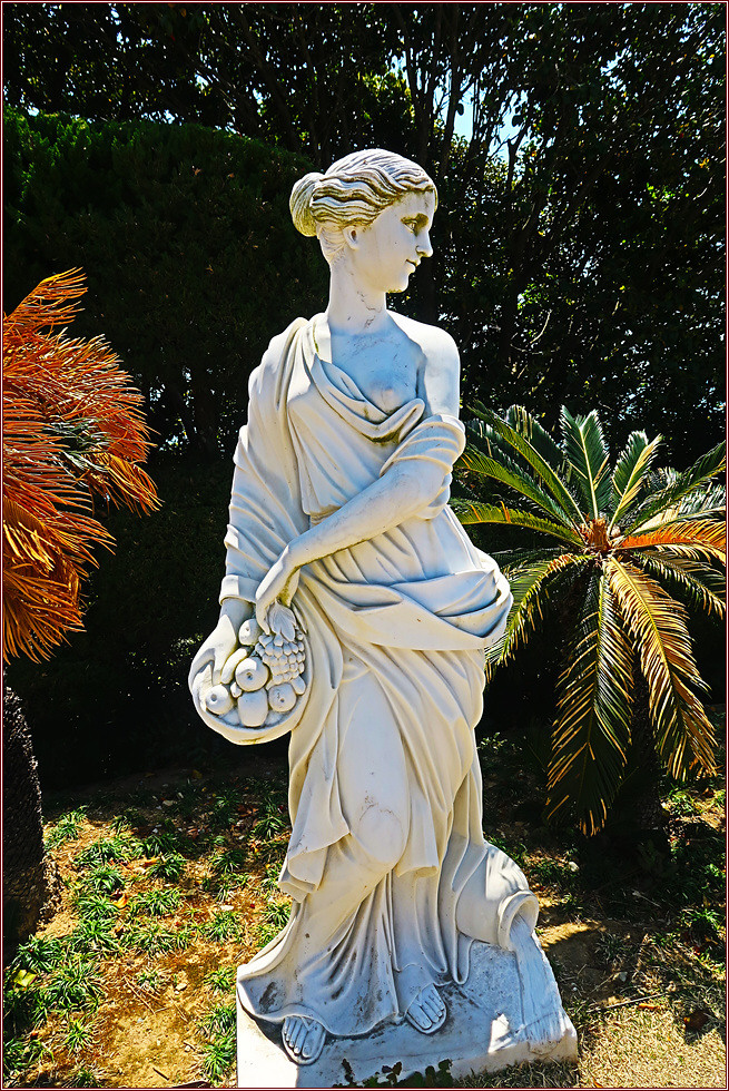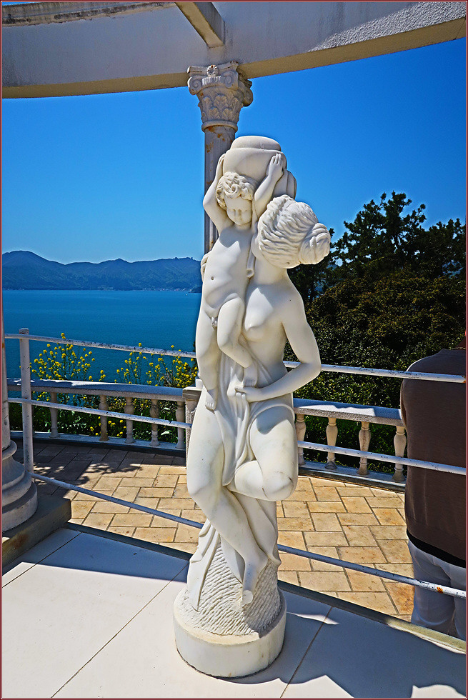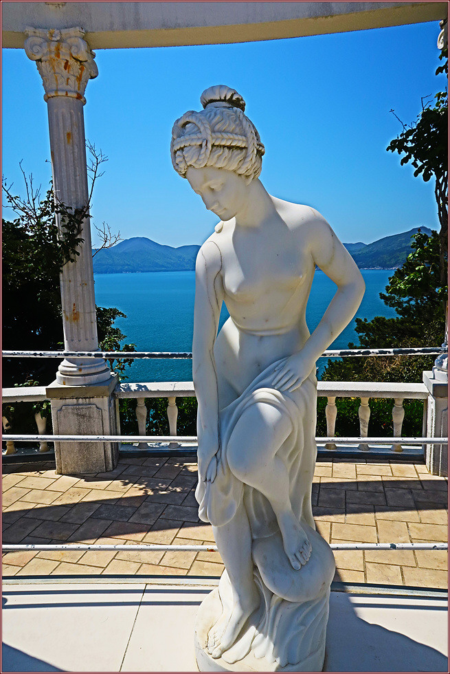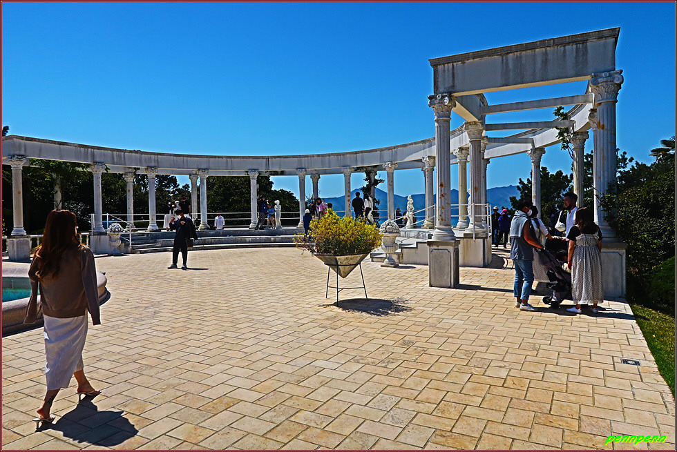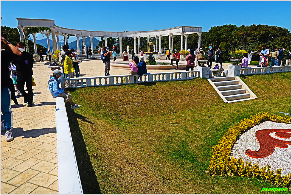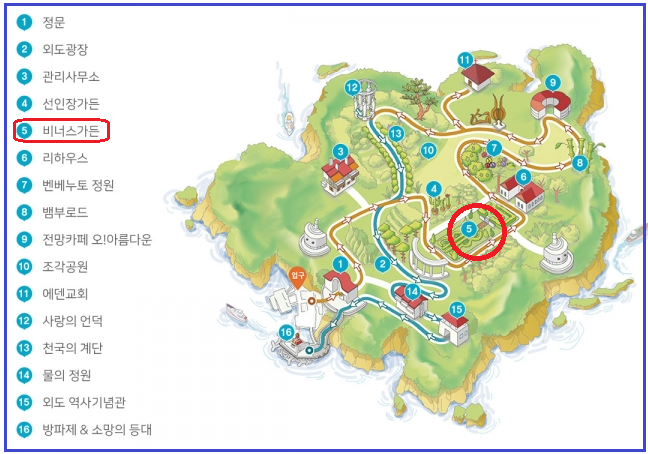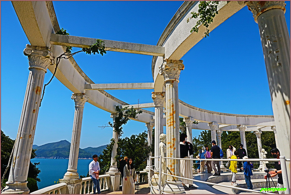 외도 보타니아 관람코스를 따라 선인장가든을 지나면 비너스가든인데요. 이곳에 들어서면 외국 궁궐 같은 반원형태의 조형물에 여러 기의 비너스동상이 세워져 있습니다. 이곳에서 바다를 보면 외도선착장을 오가는 유람선의 모습이 내려다보입니다.