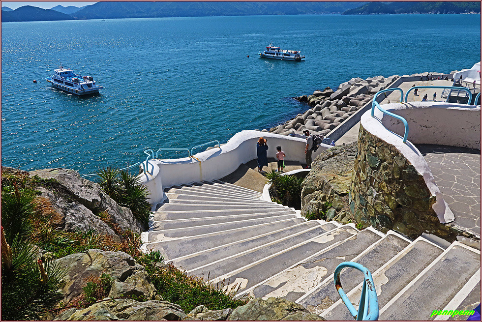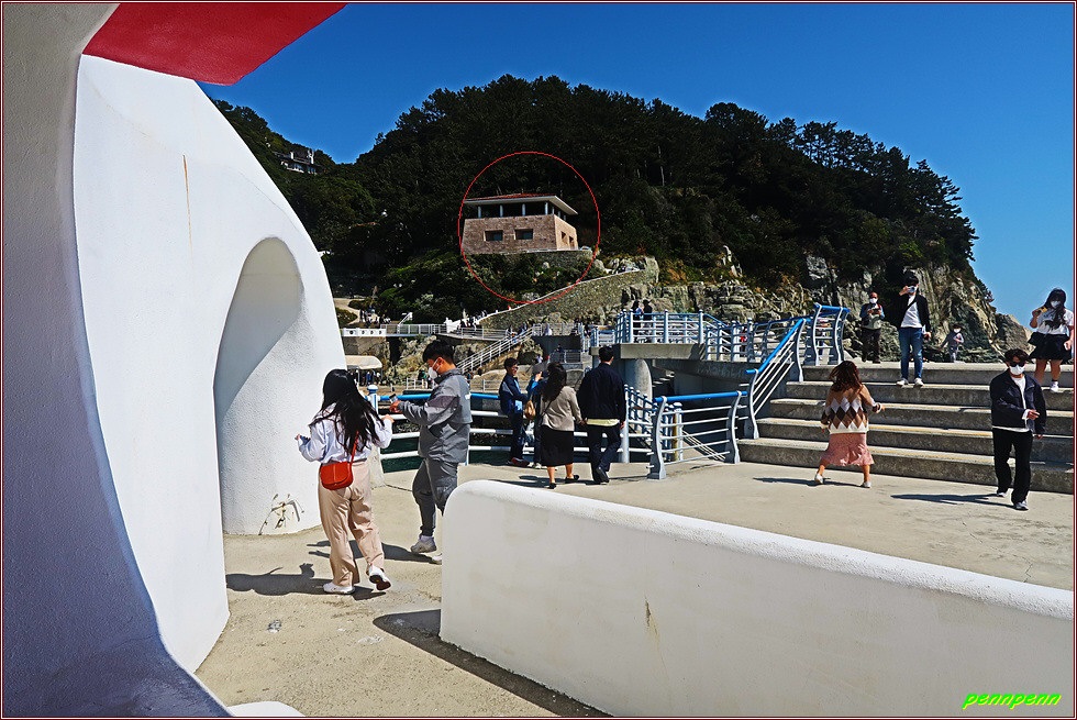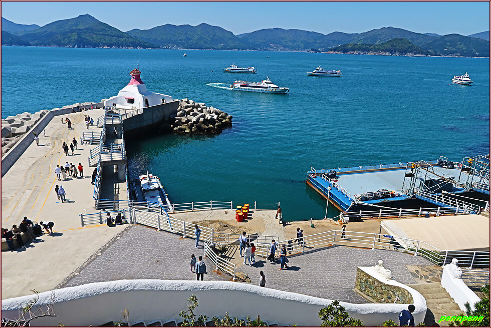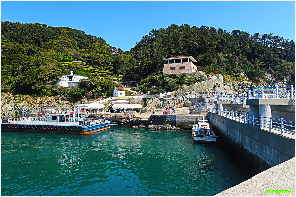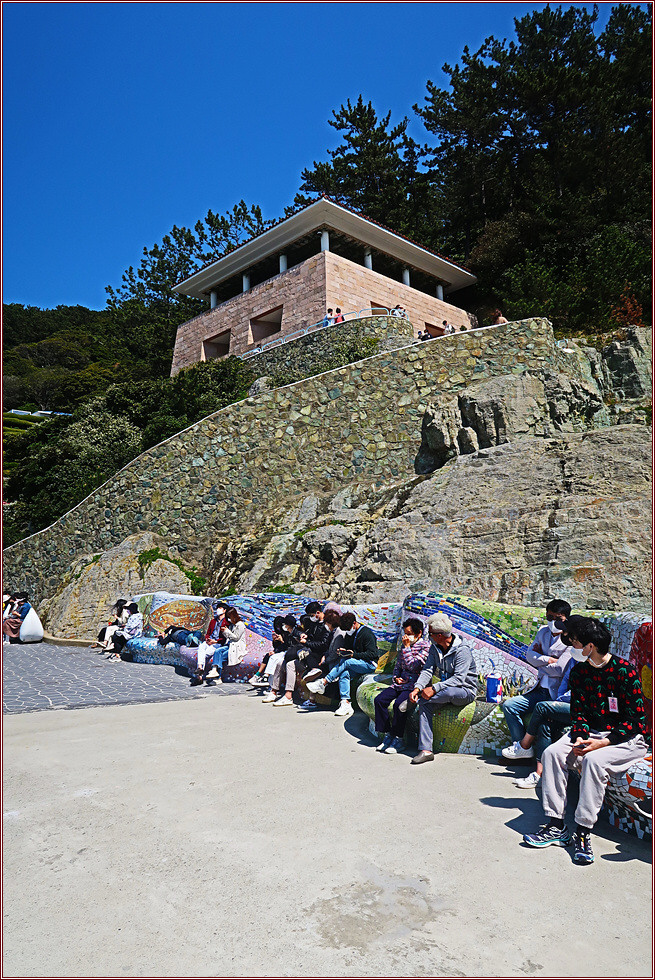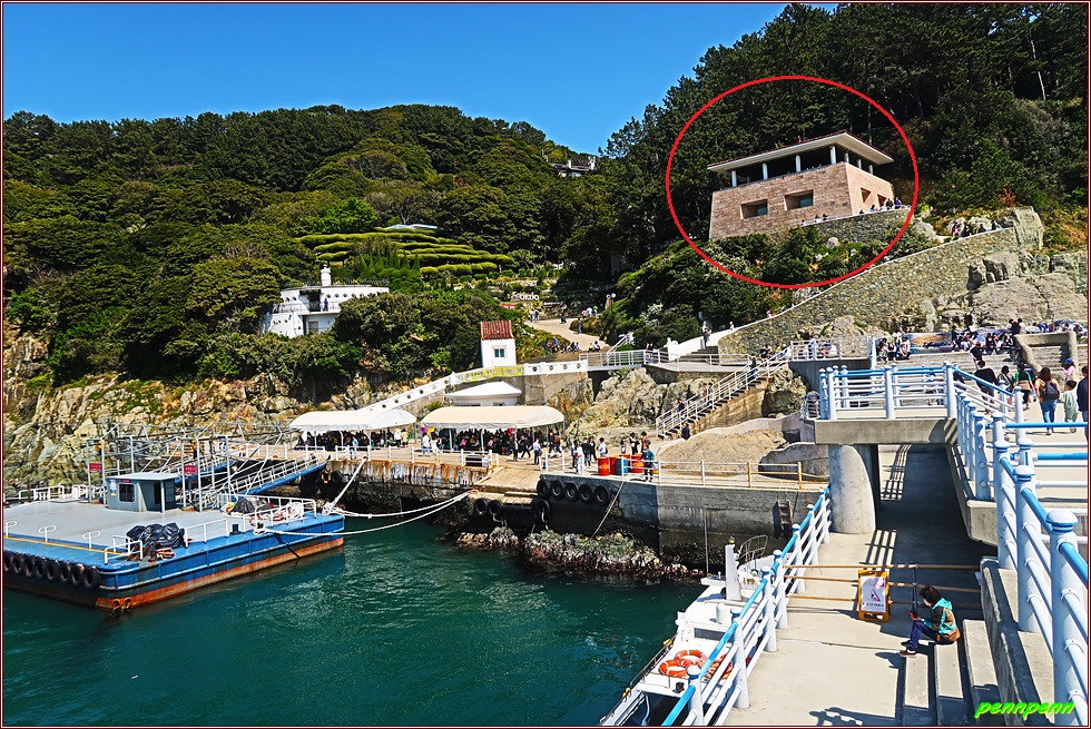 방파제로 가는 길목의 벽화가 있는 긴 의자에는 사람들이 배의 출항시간을 기다리며 망중한(忙中閑)을 보내고 있습니다. 방파제 끝에 있는 소망의 등대로 가니 기념관의 모습이 잘 보이네요. 마침 이 때 유람선 1척이 입항하자 기다리던 사람들이 승선하기 시작합니다.