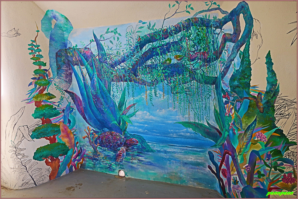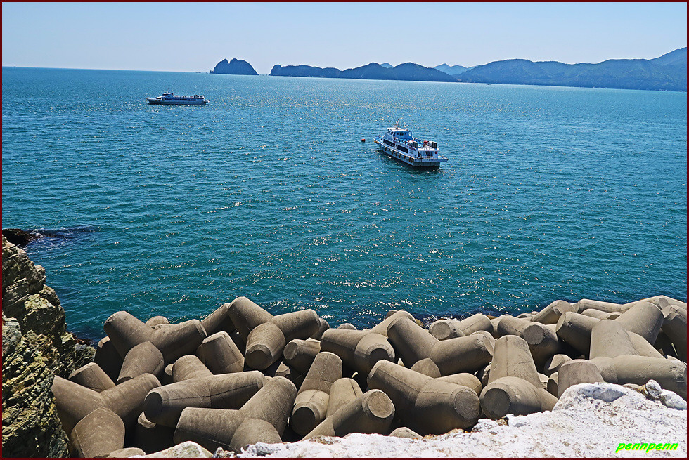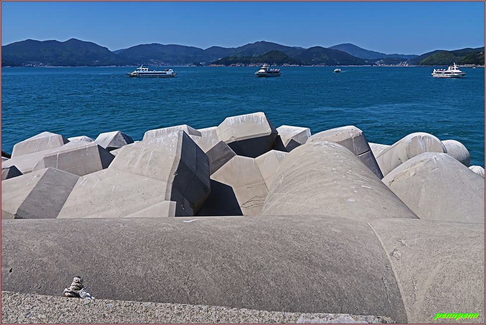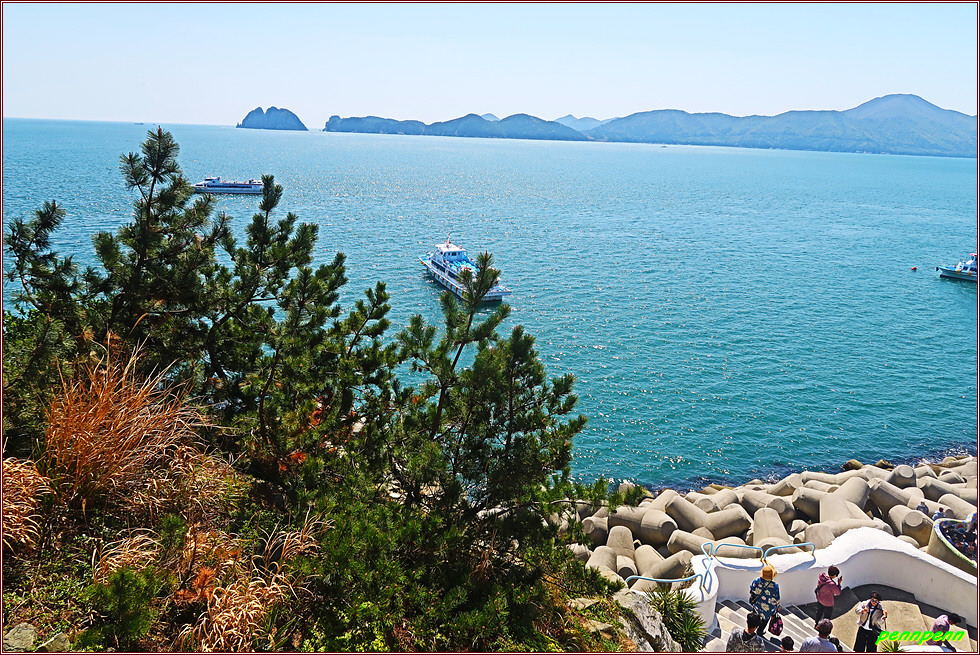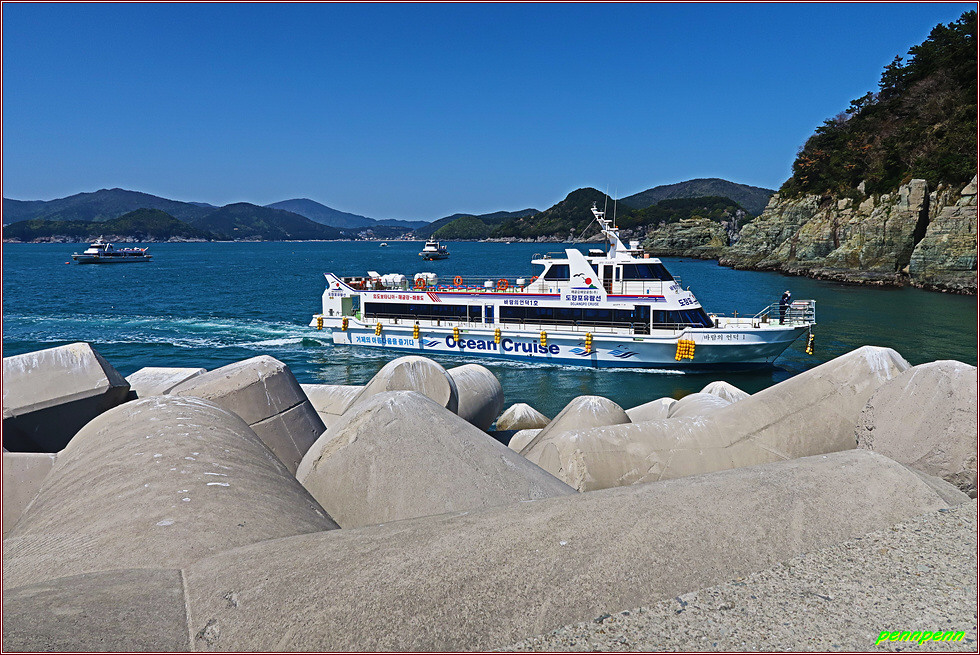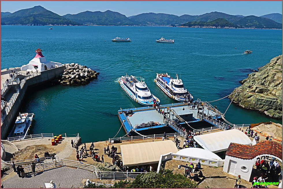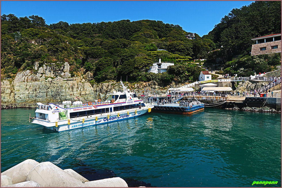 방파제로 가는 길목의 벽화가 있는 긴 의자에는 사람들이 배의 출항시간을 기다리며 망중한(忙中閑)을 보내고 있습니다. 방파제 끝에 있는 소망의 등대로 가니 기념관의 모습이 잘 보이네요. 마침 이 때 유람선 1척이 입항하자 기다리던 사람들이 승선하기 시작합니다.