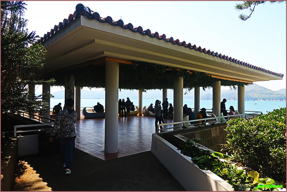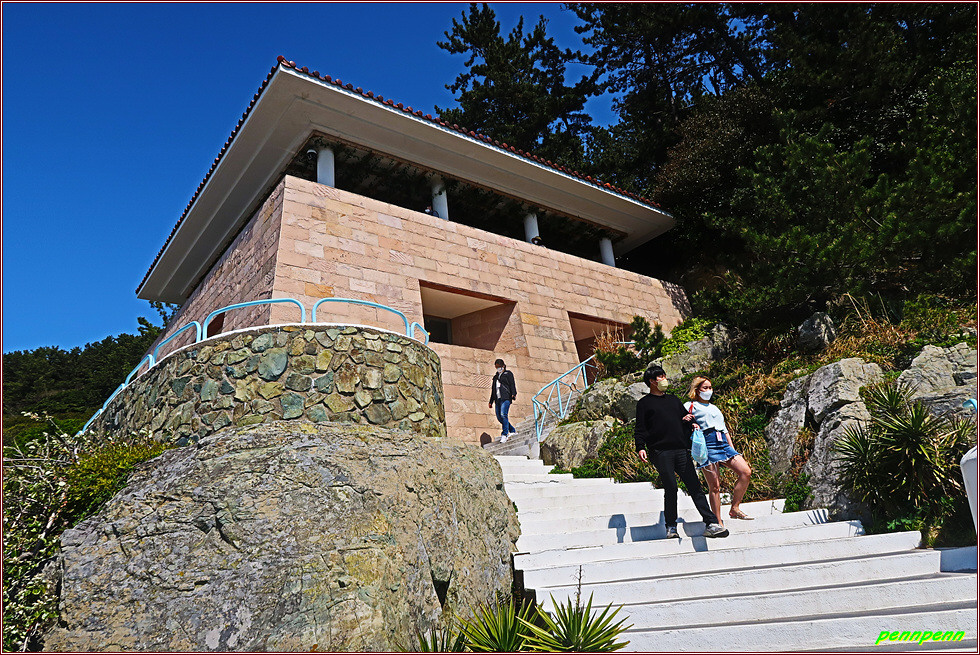 외도 역사기념관은 외도의 개발 과정과 관련한 여러 가지 자료들을 전시해 놓은 곳으로 2층 누각은 바다전망대입니다. 이 기념관은 보타니아를 전부 돌아본 후 선착장으로 내려서기 직전에 있는데, 바다전망대인 2층 누각에 오르면 외도선착장과 방파제 및 소망의 등대가 바로 눈앞에 있고 멀리 해금강과 거제도가 바라보이는 조망의 명소입니다.