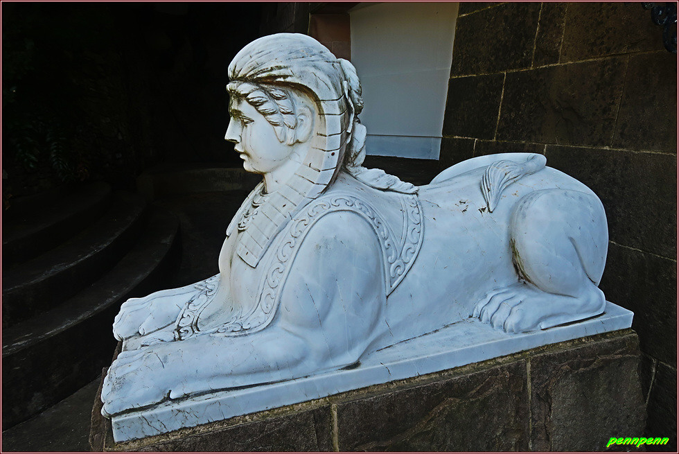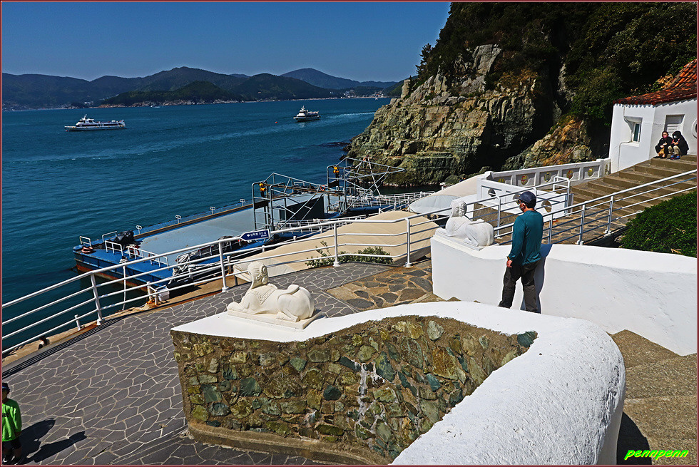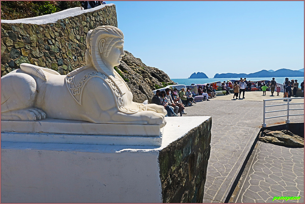 기념관을 나와 계단을 이용해 방파제로 내려섭니다. 계단에서 바라보는 한려해상국립공원의 해금강과 남해바다가 정말 환상적입니다. 계단을 내려오면 입구에 역시 이집트 여신상 같은 조각상이 있더군요.