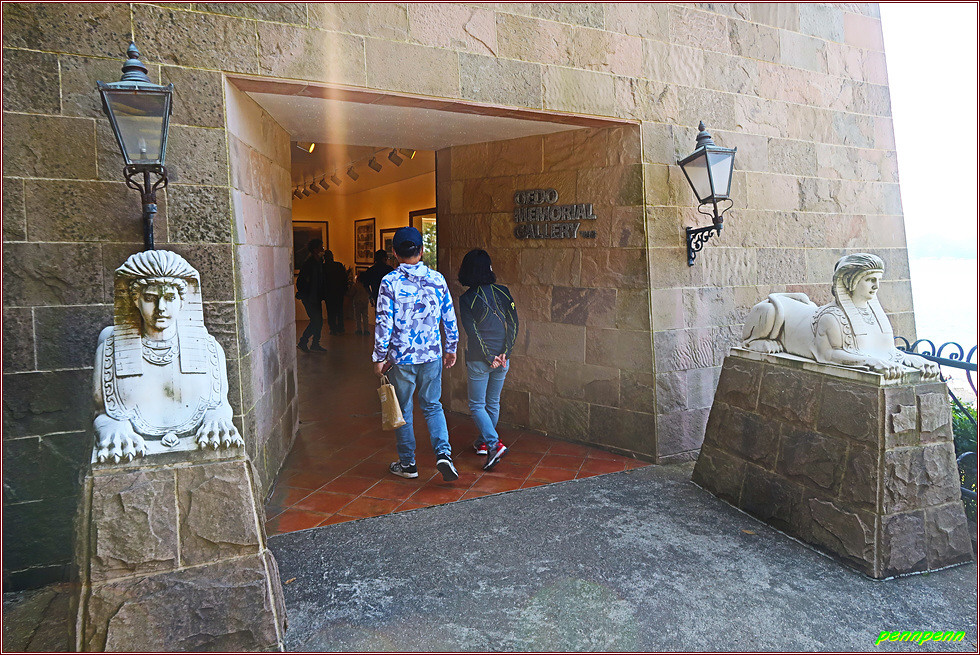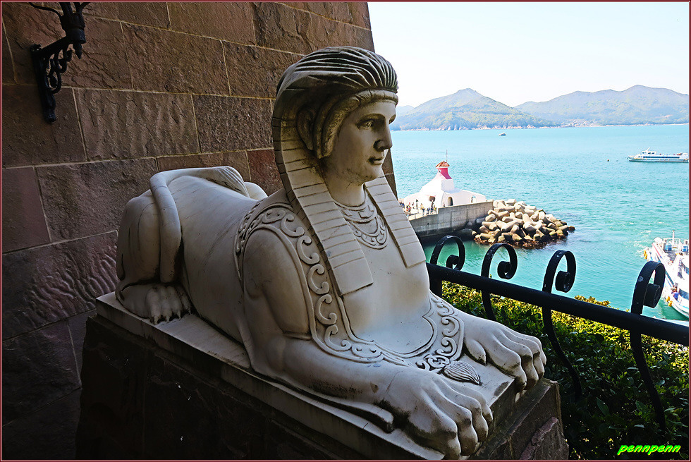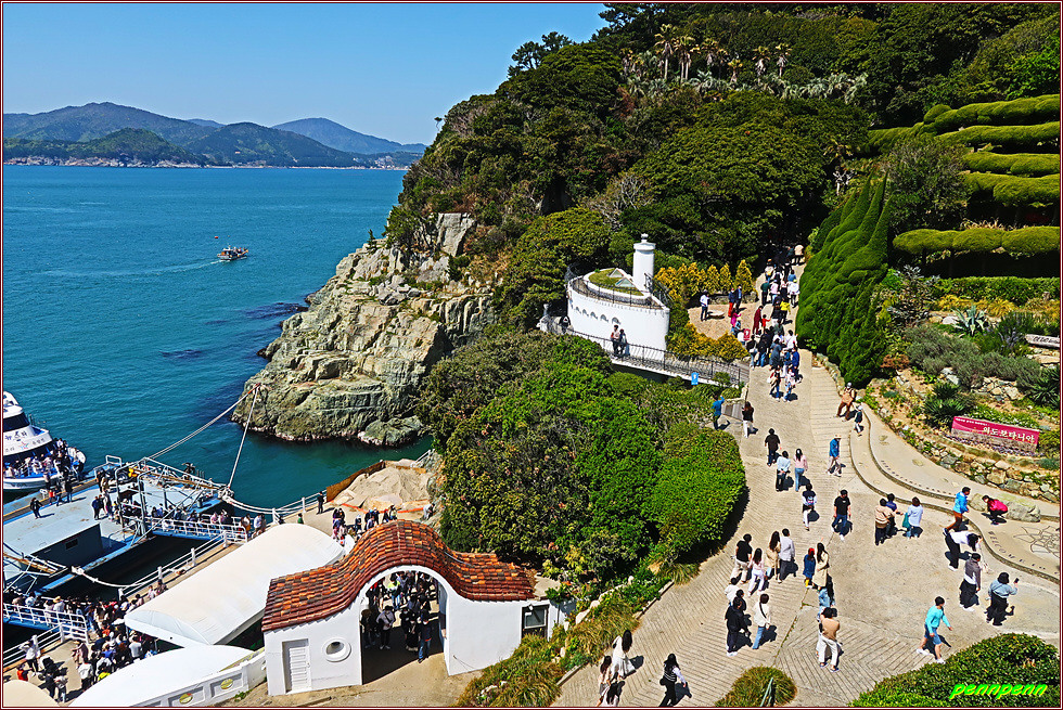 전망대를 내려오면 기념관인데, 입구에는 외도 메모리얼 갤러리(OEDO MEMORIAL GALLERY)라는 현판이 붙어 있습니다. 기념관 입구 양쪽은 이집트의 여신상 같은 조각상이 놓여져 있네요. 여기서는 방금 유람선에서 하선한 사람들이 외도광장 옆으로 가는 모습이 생생하게 보입니다.