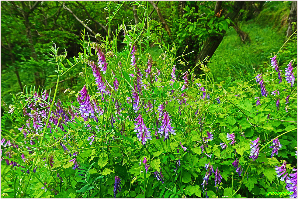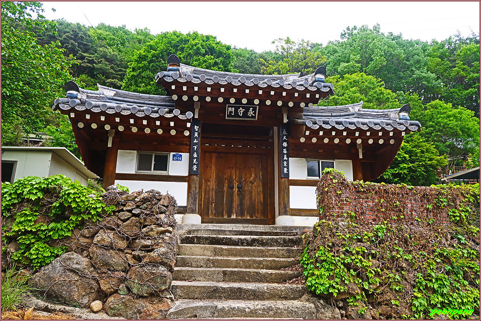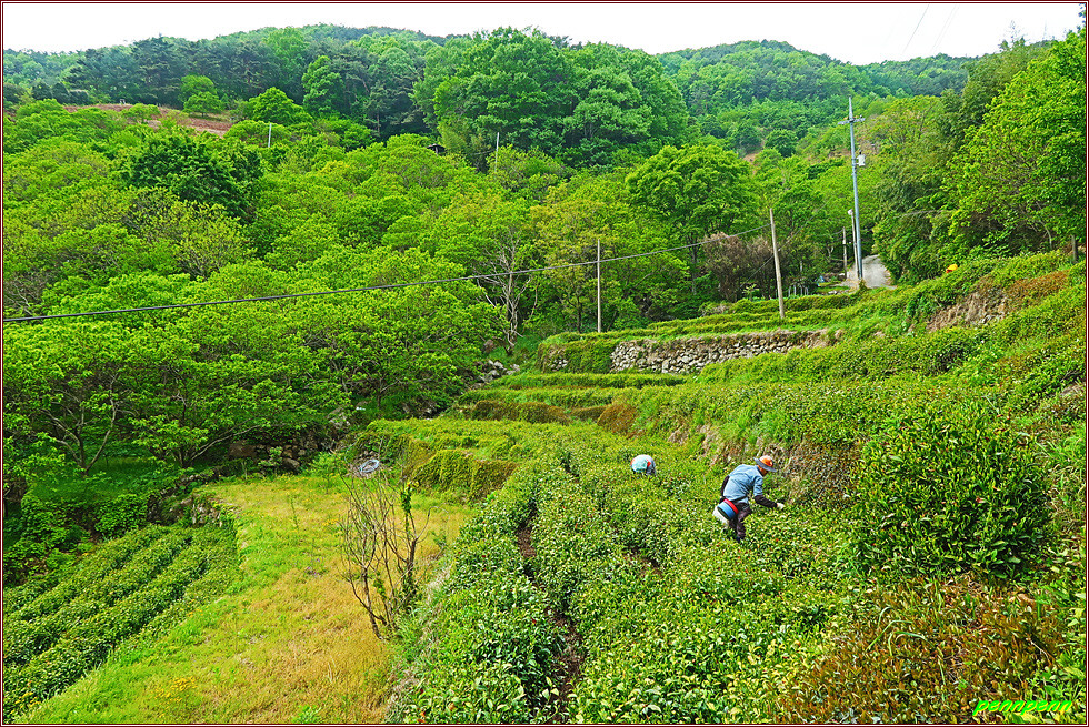 열매를 맺은 자두나무와 보랏빛 갈퀴나물을 뒤로하면 녹차를 수확하고 있는 농부의 모습도 목격됩니다. 전형적인 산촌마을의 가옥 위쪽에는 어느 지체 높은 가문의 재실 앞에 세운 솟을 대문인 영수문(永水門)이 우뚝합니다. 가파른 임도를 오른 후 좌측의 산 속으로 접어드니 멀리 조망이 터지는데 바로 화개장터가 있는 곳의 섬진강을 가로지르는 남도대교가 잘 보입니다.