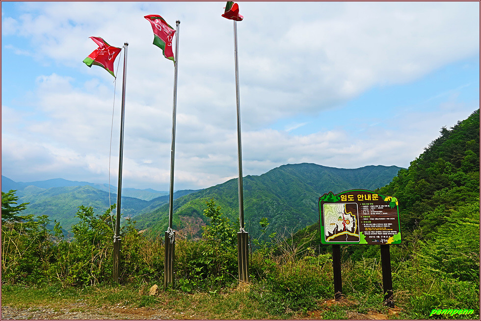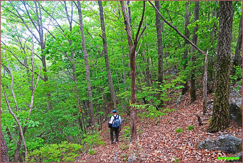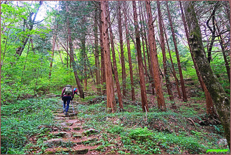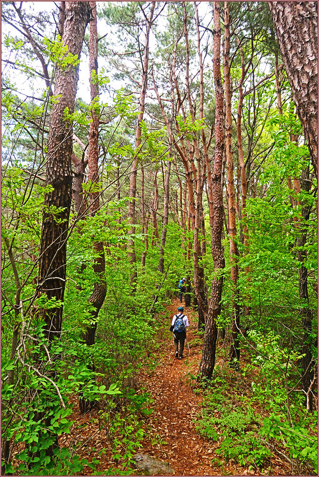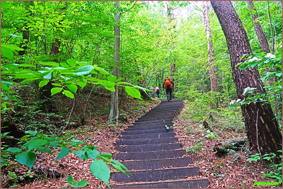 한국예술문화명인 전통차1호집에서 좌측으로 방향을 돌려 숲으로 진입합니다. 오르면서 뒤돌아보니 이름 모를 산이 우뚝하군요. 법하마을을 지나 작은 재로 오르는 이 지역을 어안동이라고 불랐는데 이는 섬진강 치수사업과 제방들을 쌓기 전에는 이곳에서 남쪽을 보면 겨울에는 항상 기러기를 볼 수 있었다고 해 지어진 이름이라고 합니다. 고도를 점점 높이면서 개활지를 벗어나면 울창한 숲입니다. 돌계단을 오르고 침엽수림을 통과하자 이번에는 급경사 침목계단 오르막이 길게 이어집니다. 작은재를 오르는 게 왜 이다지도 힘이 드는지 사람들은 고개이름을 잘 못 지었다며 혀를 내두릅니다. 두 차례의 긴 침목계단을 오르자 드디어 작은 재입니다.