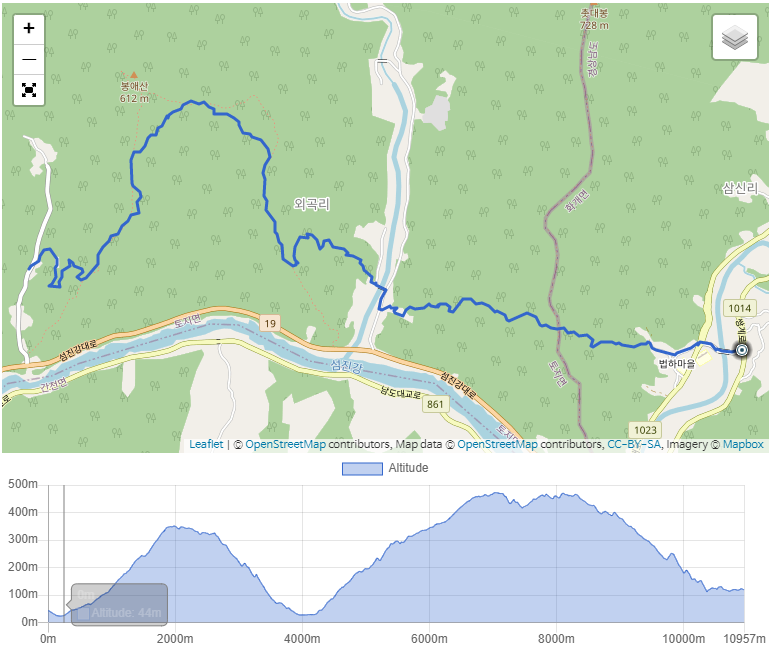 ▲ 코스 : 가탄마을-법하마을-작은재-기촌마을-내서천-추동마을-목아재-송정마을