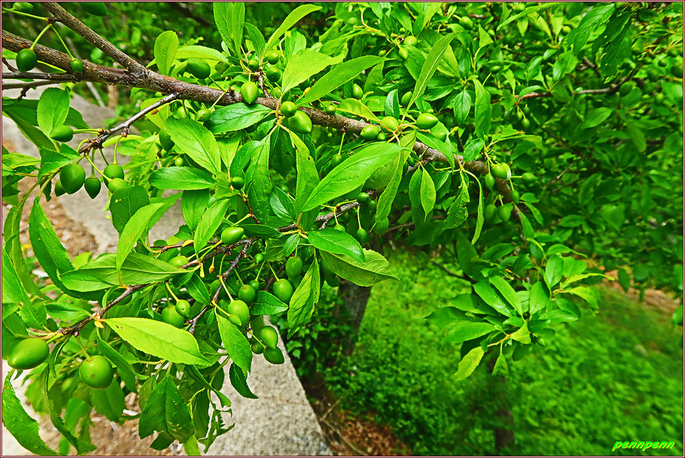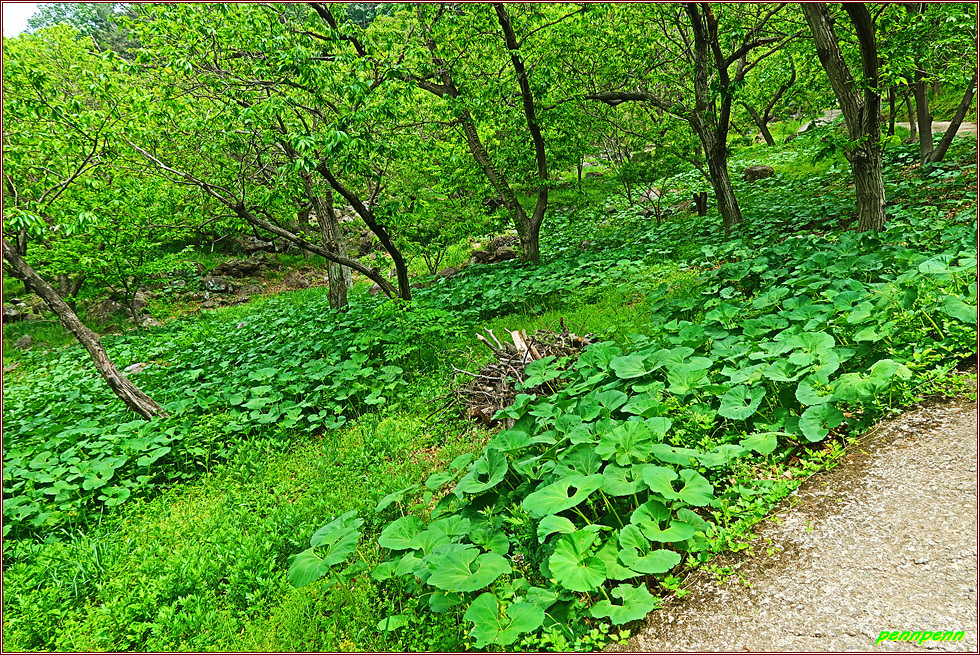 이제부터는 서쪽으로 기촌마을 향해 작은재를 내려설 차례입니다. 들꽃정원의 꽃 안내문을 뒤로하고 완만하게 이어지던 하산길은 기촌마을이 가까워지자 급경사내리막으로 변합니다. 마을 도로변에는 머루가 많이 자라는 모습입니다. 외곡교회의 빨간 첨탑이 멀리서도 눈에 잘 뜨이더군요.