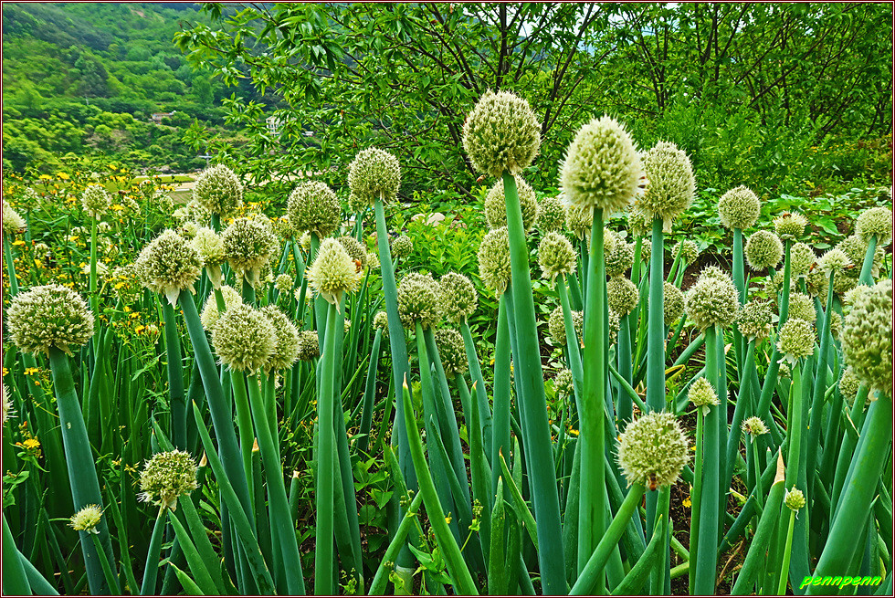정자를 지나가는데 길섶에는 대파가 탐스럽게 자라고 있습니다. 위쪽의 정자에 붙어 있는 법하마을 안내문이 길잡이 구실을 톡톡히 합니다. 법하마을이 있는 곳은 지대가 높아 섬진강과 화개천의 수해로부터 안전하여 마을이 형성된 것으로 법하는 부처님의 법 아래에 있는 마을을 뜻합니다. 이곳에 화개초등학교와 화개중학교가 있어 화개면 교육의 요람이 되었습니다. 위쪽으로 오르는 마을길이 매우 가파르군요.