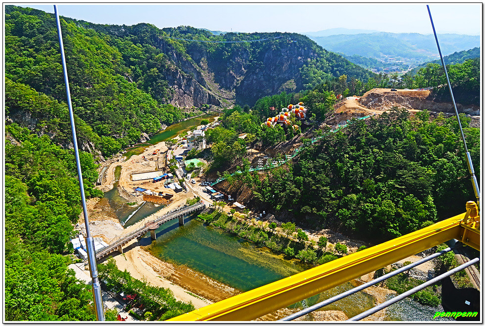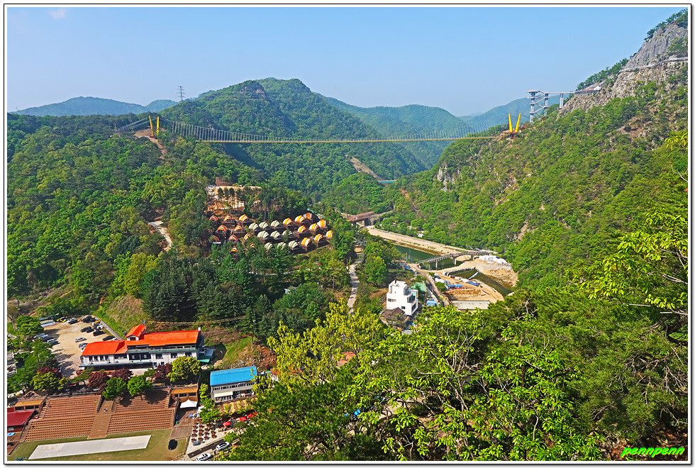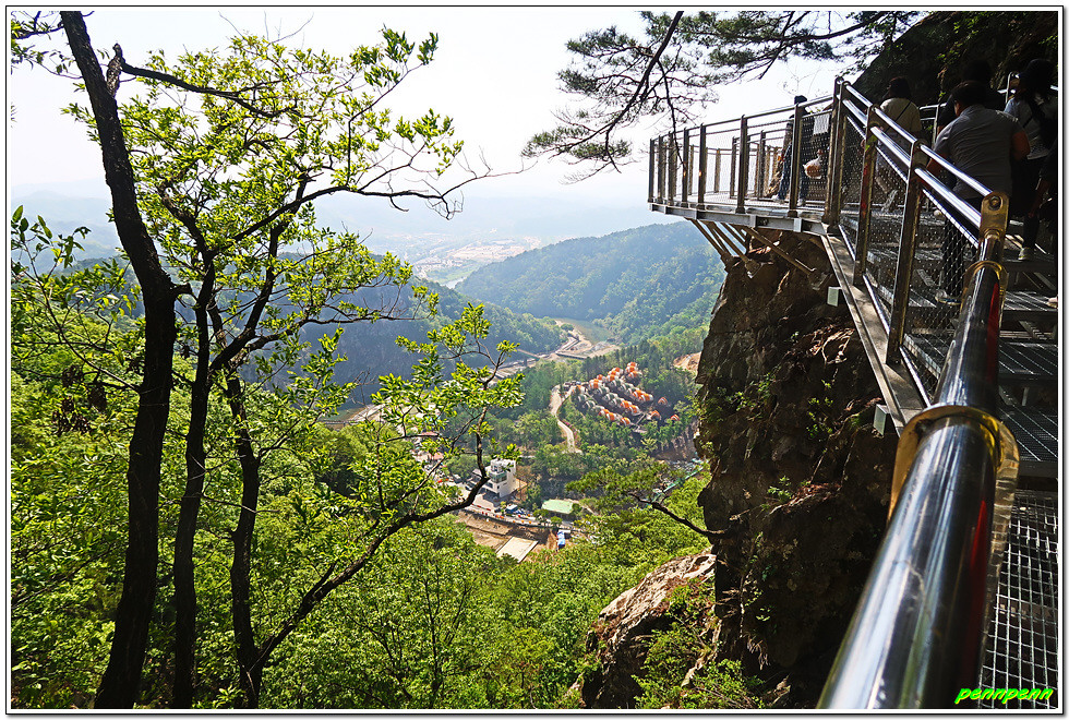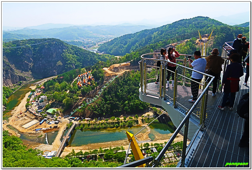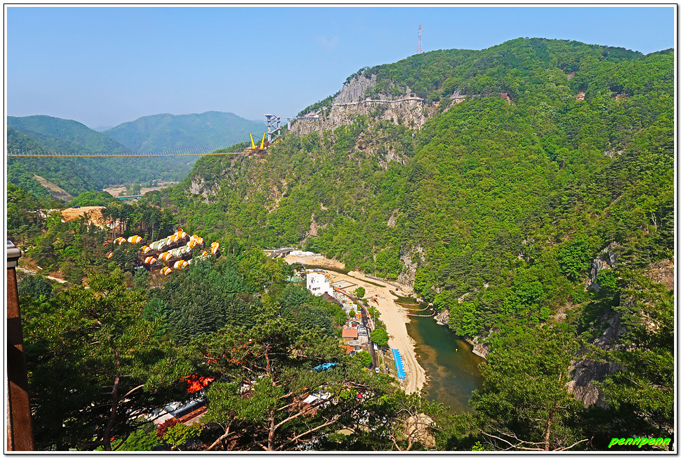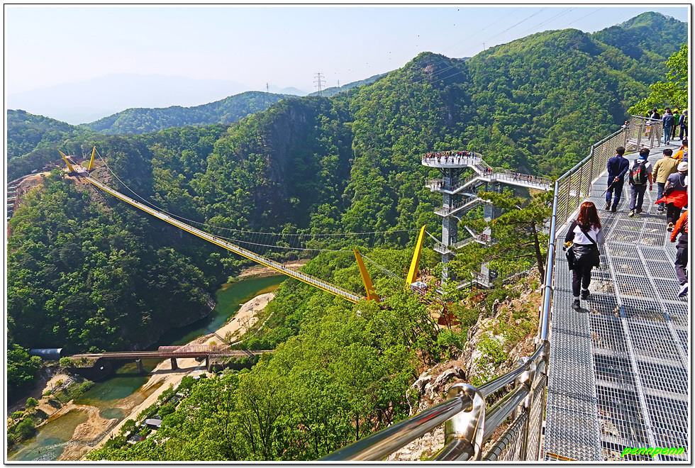 잔도를 통과하면 드디어 스카이타워입니다. 이는 소금산 정상아래 높이 38.5m, 해발고도 220m에 솟아난 전망대로 삼산천 계곡과 간현관광지를 한눈에 담을 수 있어 원주시 관광 최고의 랜드마크이며, 중부내륙 최고의 핫플레이스(hot place)입니다. 스카이타워를 내려오면서 본 풍경도 정말 일품이로군요.