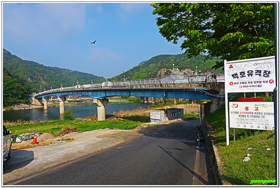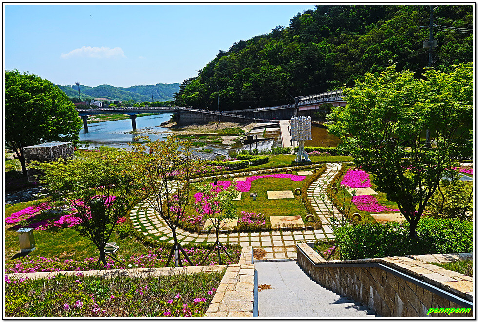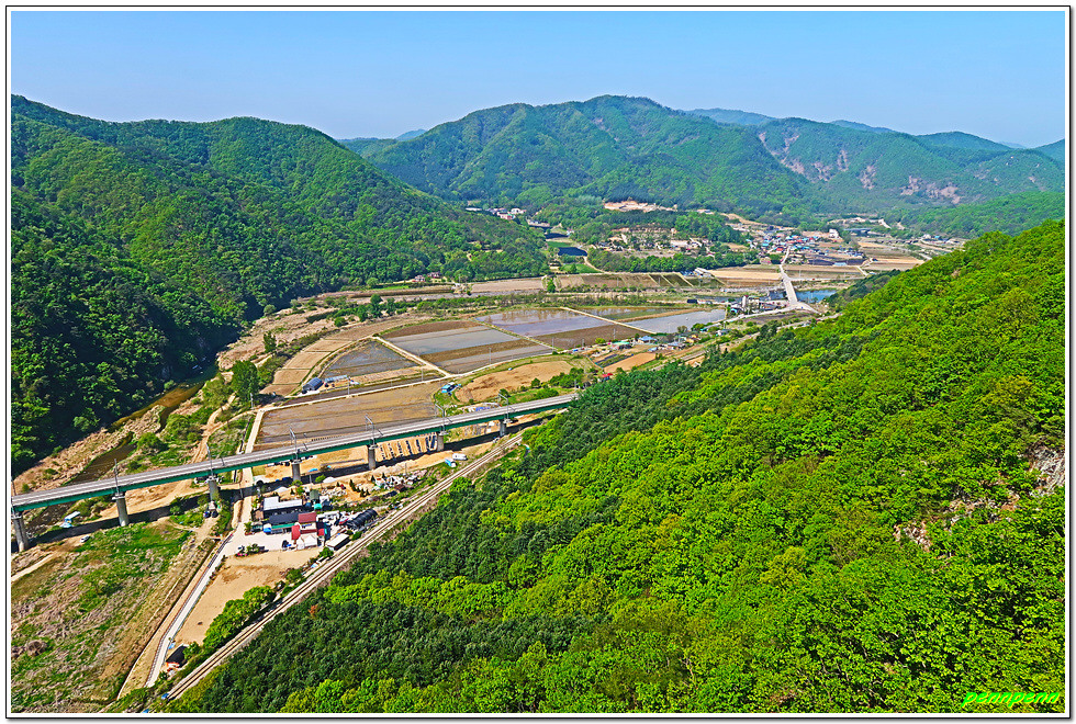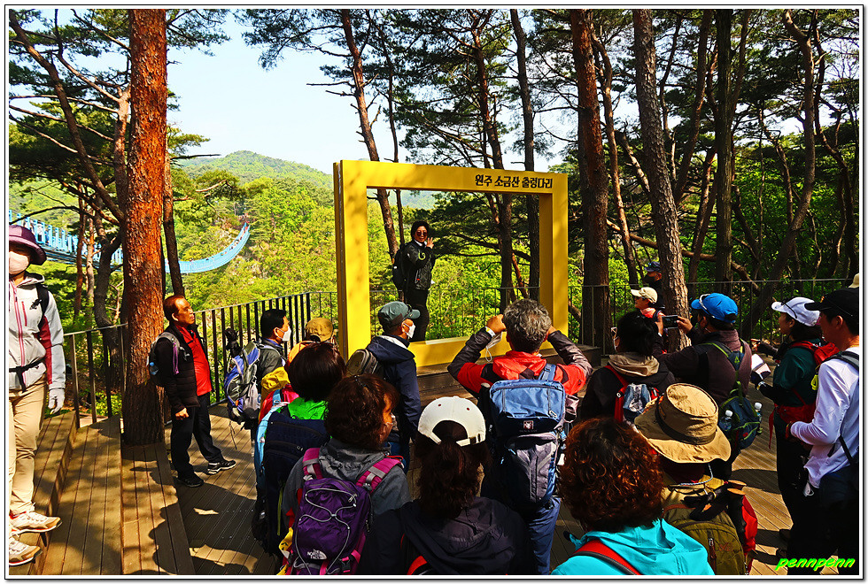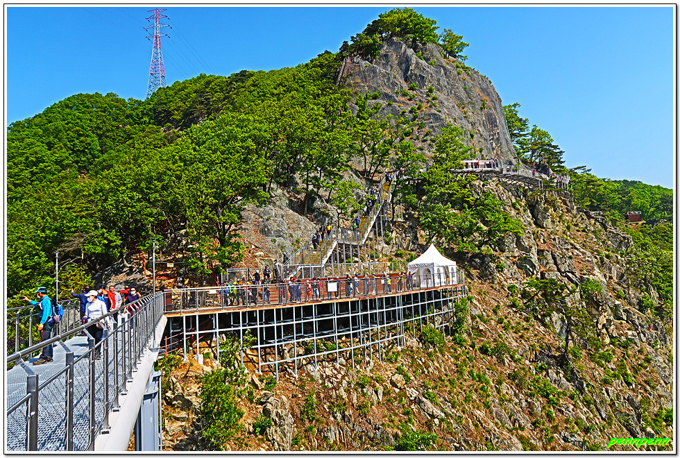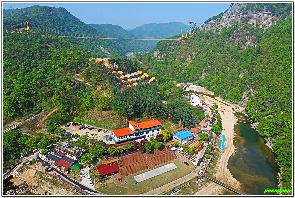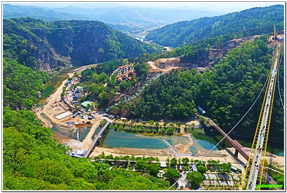 잔도를 통과하면 드디어 스카이타워입니다. 이는 소금산 정상아래 높이 38.5m, 해발고도 220m에 솟아난 전망대로 삼산천 계곡과 간현관광지를 한눈에 담을 수 있어 원주시 관광 최고의 랜드마크이며, 중부내륙 최고의 핫플레이스(hot place)입니다. 스카이타워를 내려오면서 본 풍경도 정말 일품이로군요.