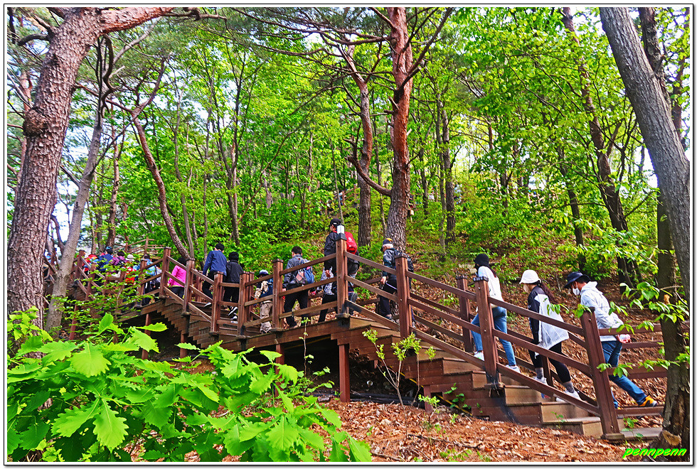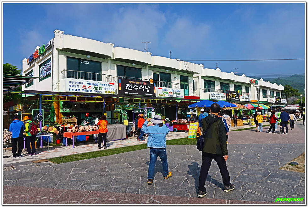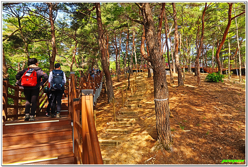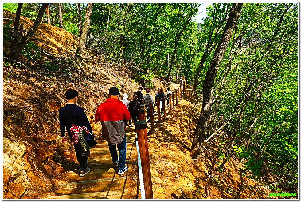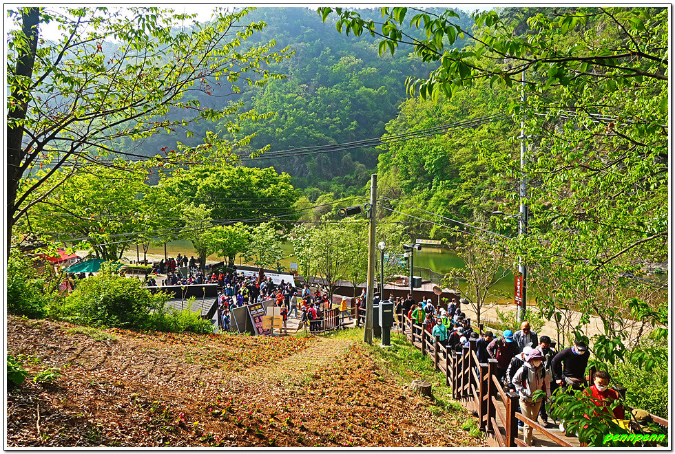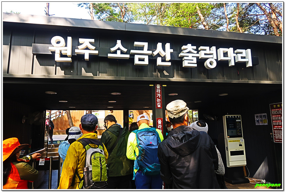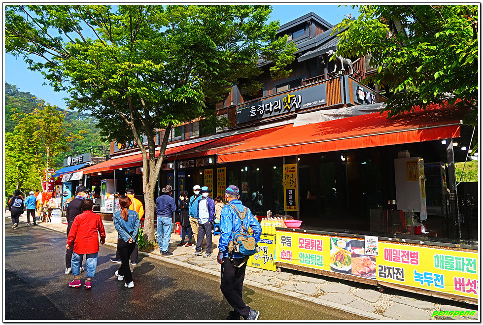 매표를 한 후 손목용 띠를 챙기고는 삼산천교를 건넙니다. 이쪽에도 식당가가 있네요. 조금 더 가면 우측 등산로 입구에 제2매표소가 있습니다. 제2매표소에는 더 많은 사람들이 줄을 서 있군요. 우리는 이미 입장권을 구입했기에 좌측의 계단으로 오릅니다.