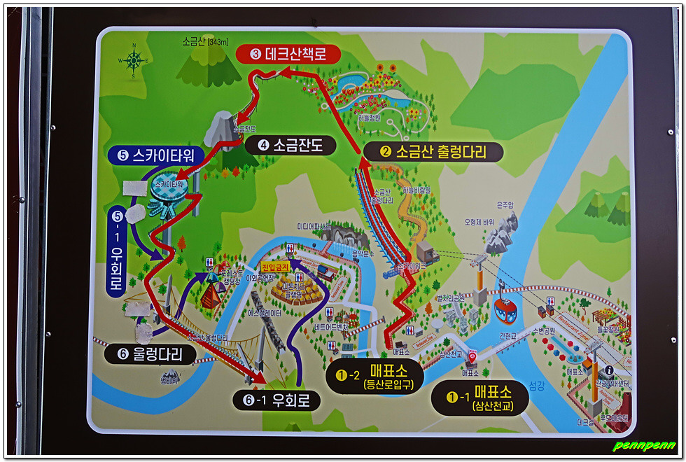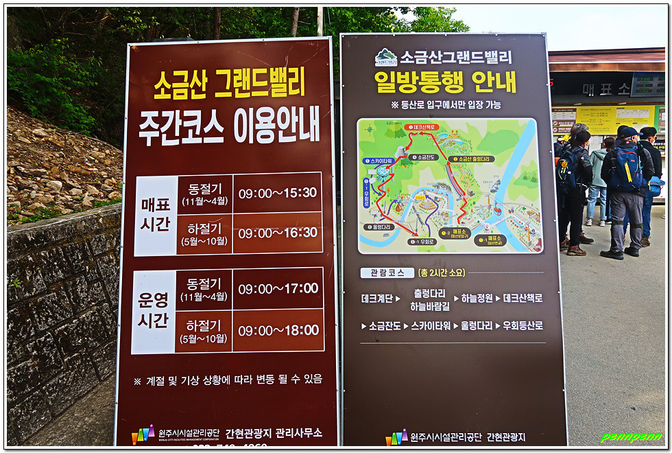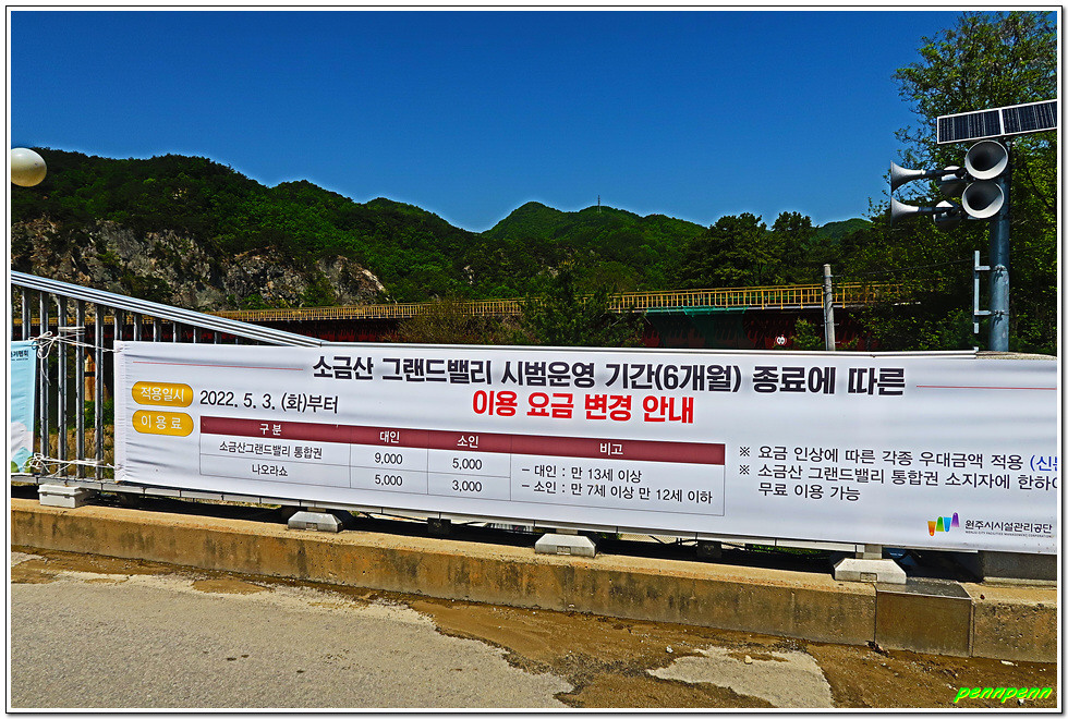 간현관광지 주차장에서 음식점 거리를 지나 섬강에 걸린 간현교를 건너면 삼산천교 입구에 매표소가 있습니다. 우리가 도착한 시각은 아침 8시 50분인데 매표시각이 9시라서 10분을 기다리는데 엄청 지루합니다. 주말에 사람이 많이 몰릴 때는 30분 또는 1시간 정도 운영시간을 앞당기면 참 좋을 테지요. 특히 무인매표소의 경우는 무인매표기만 좀 더 일찍 작동하면 사람들의 불평불만이 줄어들 것입니다. 입장요금(대인기준)은 현재는 3천원이지만 시범운영기간(6개월)이 종료되는 5월 3일부터는 9천원으로 인상된다는군요.