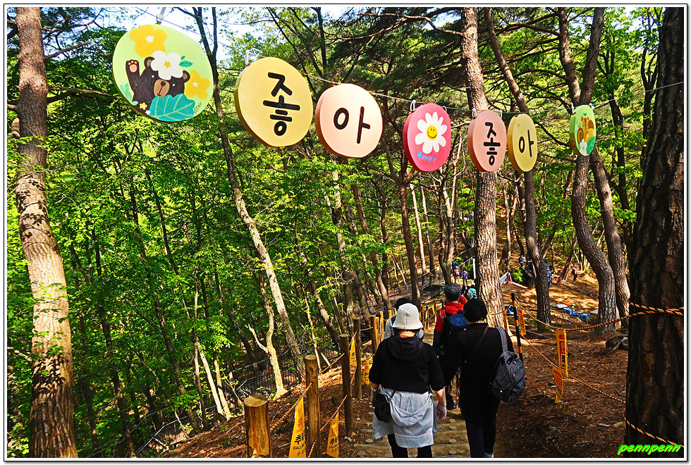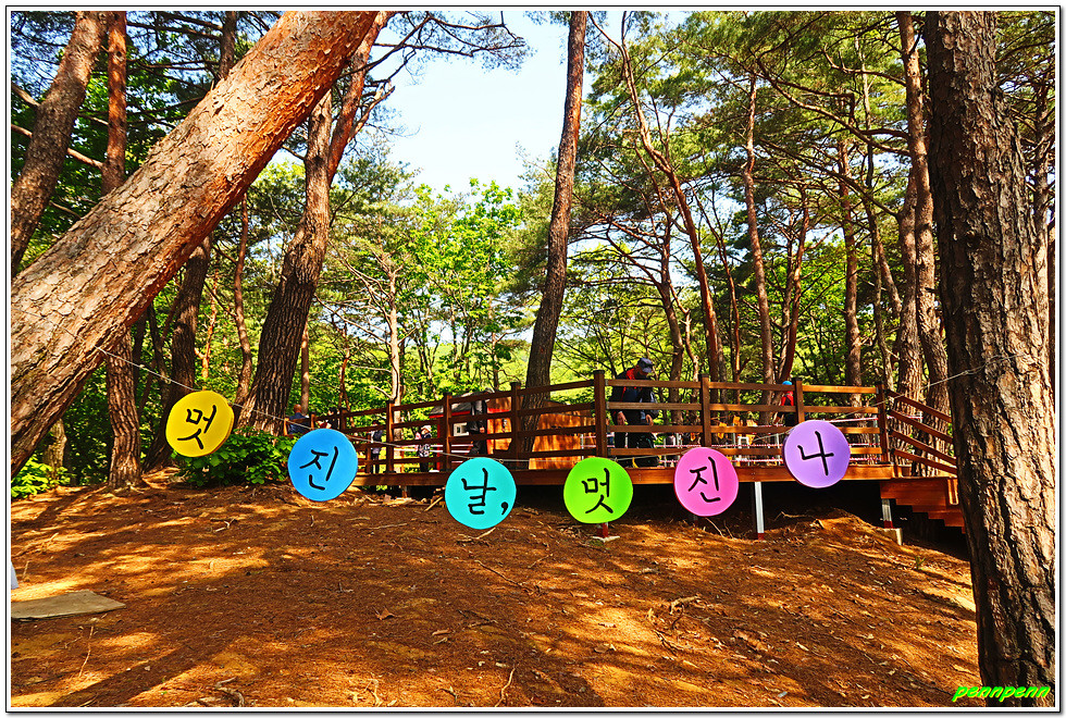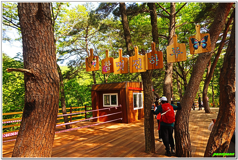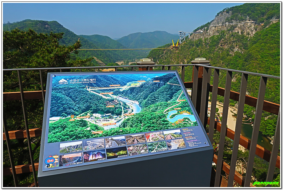 계단을 다 오르면 출렁다리 입구인데 이곳은 입장권을 가진 사람만 출입할 수 있습니다. 안쪽에는 기념사진을 찍을 수 있는 사각액자와 입체형글씨가 세워져 있네요. 여기서 나무계단을 오르면 드디어 출렁다리입니다. tvN 드라마 “사이코지만 괜찮아”를 촬영했다는 안내문도 보입니다. 또한 이곳에서는 가야할 소금잔도와 스카이타워 및 울렁다리가 한눈에 들어옵니다.