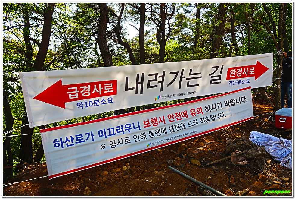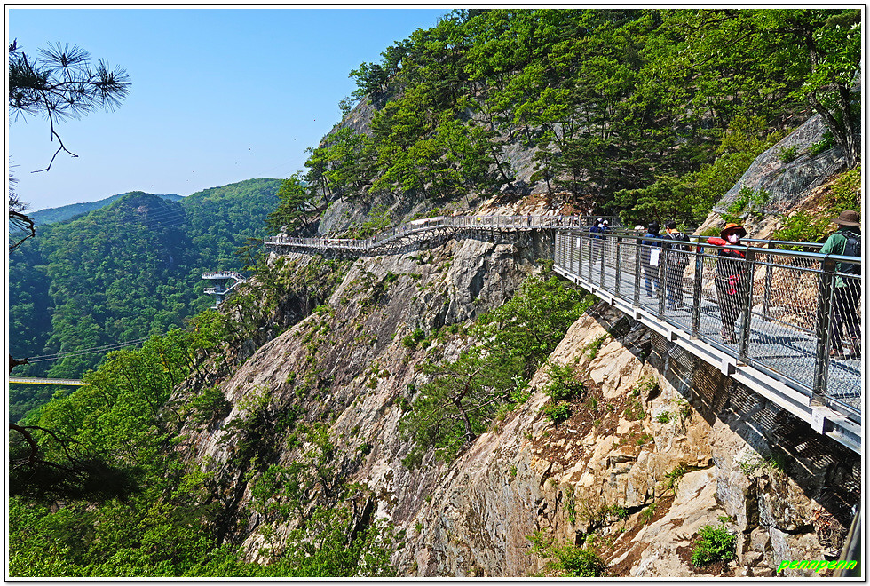 출렁다리를 건너온 후 데크산책로를 이용해 약 1km 정도 가면 소금잔도입니다. 데크산책로에도 이용자들에게 꿈과 희망 그리고 위로해주는 따뜻한 인사말이 있네요. 소금잔도는 소금산 정상아래 깎아지른 듯한 절벽에 선반을 매달아 만든 363m의 보도로 중국 장가계의 잔도와 견줄 수 있는 국내 최고높이의 산악잔도입니다. 암벽을 따라 걷는 것은 마치 허공을 걷는 듯한 짜릿한 경험을 선사합니다. 특히 잔도에서 바라보는 간현계곡의 삼산천과 스카이타워 및 울렁다리의 모습은 한폭의 동양화를 보는 듯한 절경을 맛볼 수 있습니다. 사실 14년 전 필자가 중국 장가계 천문산 잔도를 걸을 때는 혹시나 길이 무너지면 어쩌나하는 두려움이 있었지만 이곳은 우리나라 기술력을 믿기에 안심하고 걷습니다.