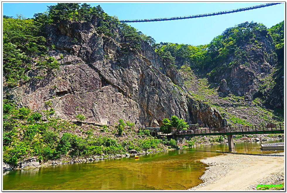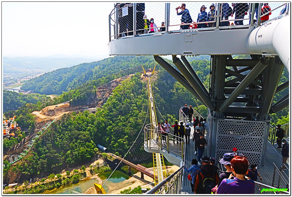 스카이타워를 내려오면 이제는 울렁다리를 건너야 합니다. 소금산 울렁다리는 길이 404m, 높이 100m의 보행현수교로 삼산천을 가로질러 소금산과 간현봉을 이어주는 다리입니다. 한때는 길이가 270m인 전북 순창 채계산 출렁다리가 국내 최장 산악형 현수교였지만 이곳 울렁다리에 비하면 이젠 명함을 내밀 수 없게 되었습니다. 이 울렁다리는 산악형이 아닌 일반 출렁다리로 가장 예산 예당호 출렁다리(402m)보다 2m가 더 길어 그야말로 국내에서 가장 긴 출렁다리의 반열에 오른 것입니다.