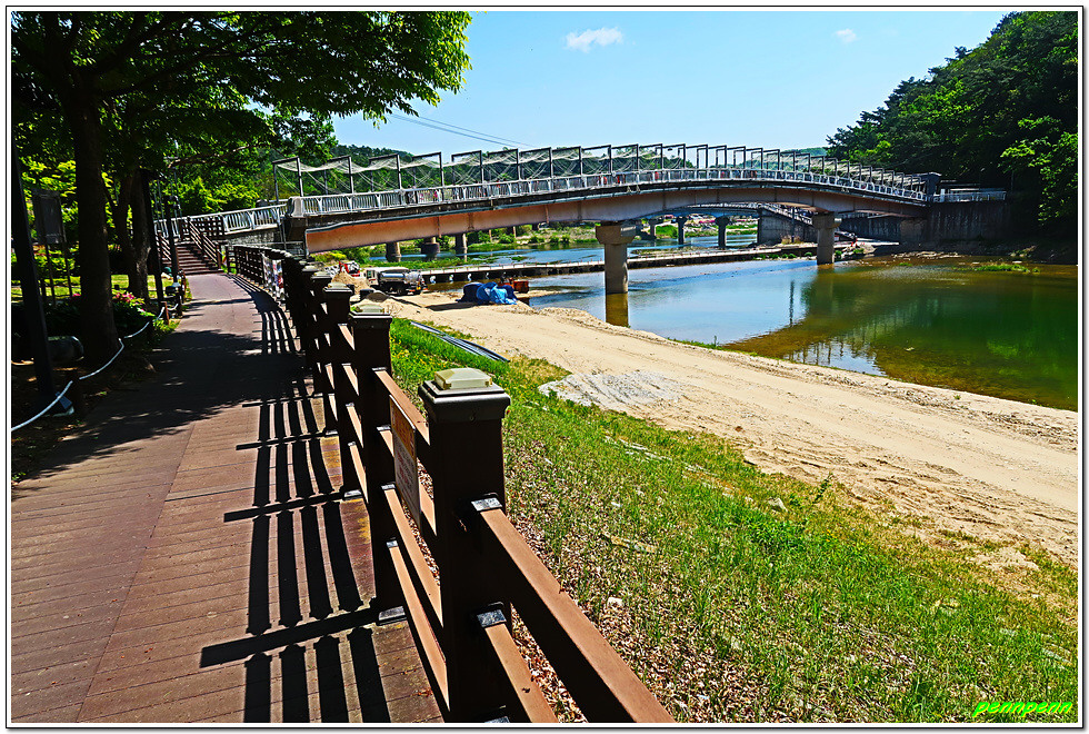 울렁다리를 건너면 소금산 그랜드밸리의 하이라이트는 모두 경험한 셈입니다. 여기서 우측으로는 간현봉으로 이어지지만 좌측 급경사 길로 내려서면 삼산천을 만나게 되고 암벽훈련장을 지나면 출렁다리가 바로 머리 위로 보입니다. 철교 아래를 지나 아까 만났던 제2매표소를 뒤로하면 삼산천교인데, 이를 건너기 전 별자리공원을 둘러볼 것을 권장합니다.