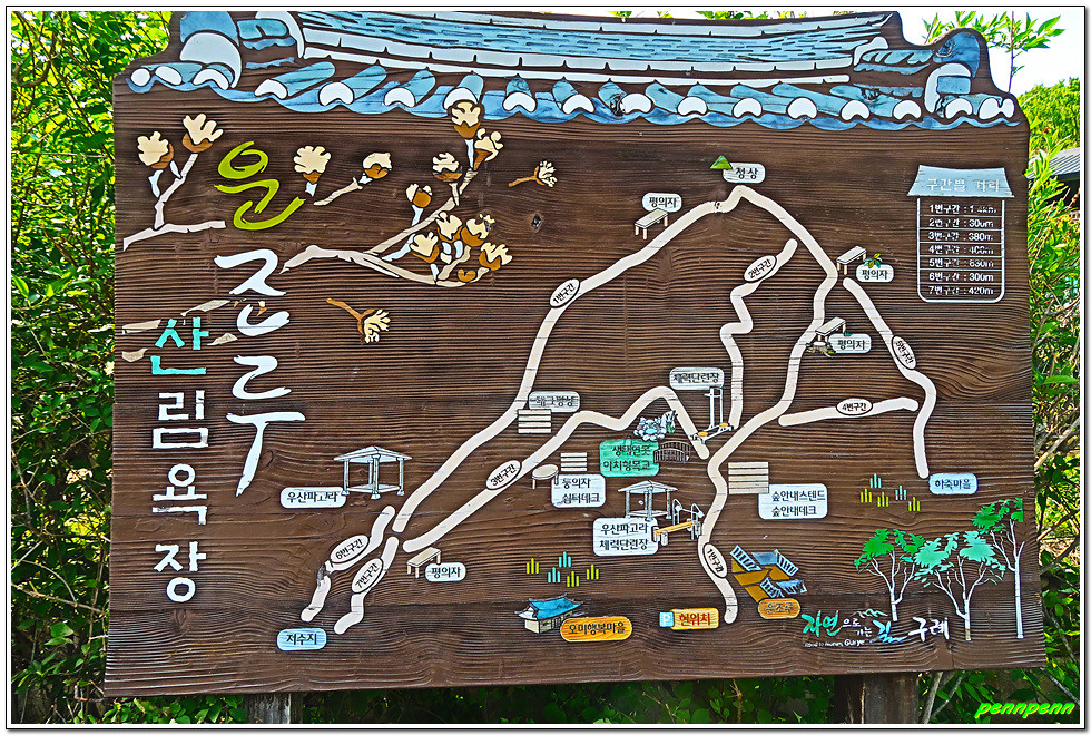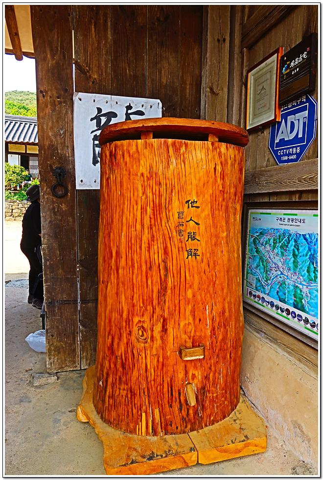 운조루 입구에는 이곳을 중심으로 산림욕장이 조성되어 있다는 안내지도와 구례주요관광지(20곳) 사진이 계시되어 있네요. 정문 앞 작은 연못은 연지입니다. 운조루는 행랑채, 사랑채, 안채와 사당으로 구성되어 있는데 특기할 만한 것은 고택의 행랑채를 이어주는 솟을대문 앞에는 “타인능해(他人能解)”라는 글이 새겨진 큰 쌀독이 있다는 것입니다. 이는 “누구든 이 쌀독을 열 수 있다”는 뜻으로 흉년이 들었을 때 굶주린 사람들에게 이 쌀독을 열어 구제했다는 미담이 전해져 옵니다(원래 쌀독은 인근 유물전시관에 보관중). 참고로 행랑채는 마굿간과 하인들이 머무는 장소입니다.